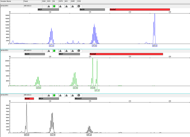 微衛(wèi)星是人類基因組的一段串聯(lián)重復(fù)序列,一般在1~6bp之間,又被稱作短串連重復(fù)(Short Tandem Repeats,STRs)或簡單重復(fù)序列(Simple Sequence Repeat,SSRs)。 微衛(wèi)星不穩(wěn)定(Microsatellite Instability,MSI)指的是微衛(wèi)星重復(fù)次數(shù)減少或者增加,微衛(wèi)星不穩(wěn)定的內(nèi)在機(jī)制是錯(cuò)配修復(fù)(MMR)系統(tǒng)失調(diào),從而限制了糾正微衛(wèi)星自發(fā)的長度改變的體細(xì)胞突變的能力,體細(xì)胞突變積累,最終形成MSI。