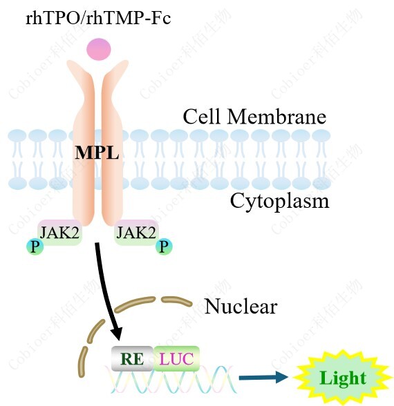 TPO Effector Reporter Cell 報告基因藥靶模型很好的模擬了體內(nèi) TPO 的信號轉(zhuǎn)導(dǎo)過程, 原理見下圖所示。![]() Figure 1. TPO Effector Reporter Cell 細(xì)胞模型原理圖 |
