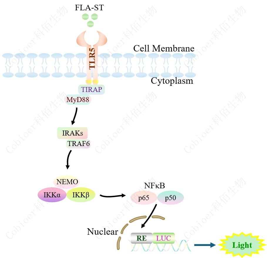 TLR5 NFκB-Luc HEK293 報告基因藥靶模型很好的模擬了體內(nèi) TLR5 的信號轉(zhuǎn)導(dǎo)過程, 原理見下圖所示。