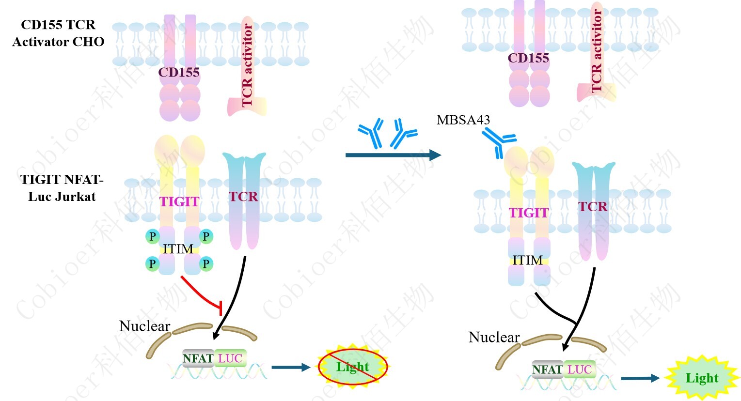 CD155 TCR Activator CHO 細(xì)胞作為 TIGIT NFAT-Luc Jurkat 細(xì)胞的靶細(xì)胞,很好的模 擬了體內(nèi) TIGIT 的信號(hào)轉(zhuǎn)導(dǎo)過(guò)程,原理見(jiàn)下圖所示。
