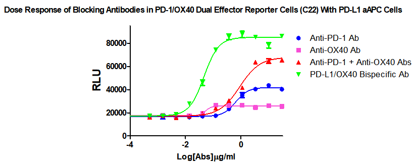 Figure 1. Dose Response of Blocking Antibodies in PD-1/OX40 Dual Effector Reporter Cells (C22) With PD-L1 aAPC Cells.