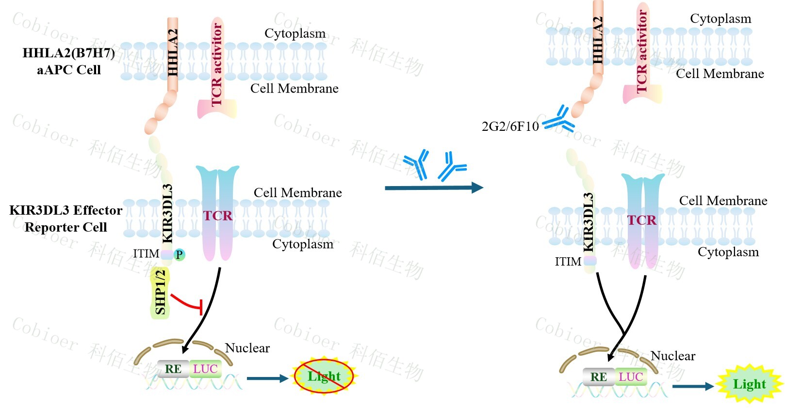 HHLA2(B7H7) aAPC Cell 作為 KIR3DL3 Effector Reporter Cell 或 TMIGD2 Effector Reporter Cell 的靶細(xì)胞 , 很好的模擬了體內(nèi) KIR3DL3/ HHLA2(B7H7) 或TMIGD2/HHLA2(B7H7)的信號轉(zhuǎn)導(dǎo)過程,原理見下圖所示。![]() ![]() Figure 1. HHLA2(B7H7) aAPC Cell 細(xì)胞模型原理圖 |