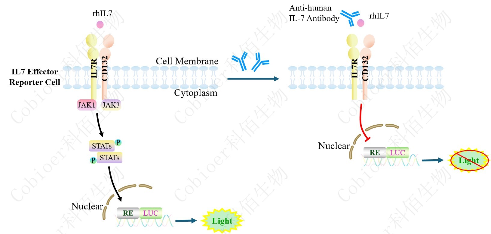 IL7 Effector Reporter Cell 報告基因藥靶模型很好的模擬了體內(nèi) IL7 的信號轉導過程,原理見下圖所示。![]() Figure 1. IL7 Effector Reporter Cell 模型原理圖 |