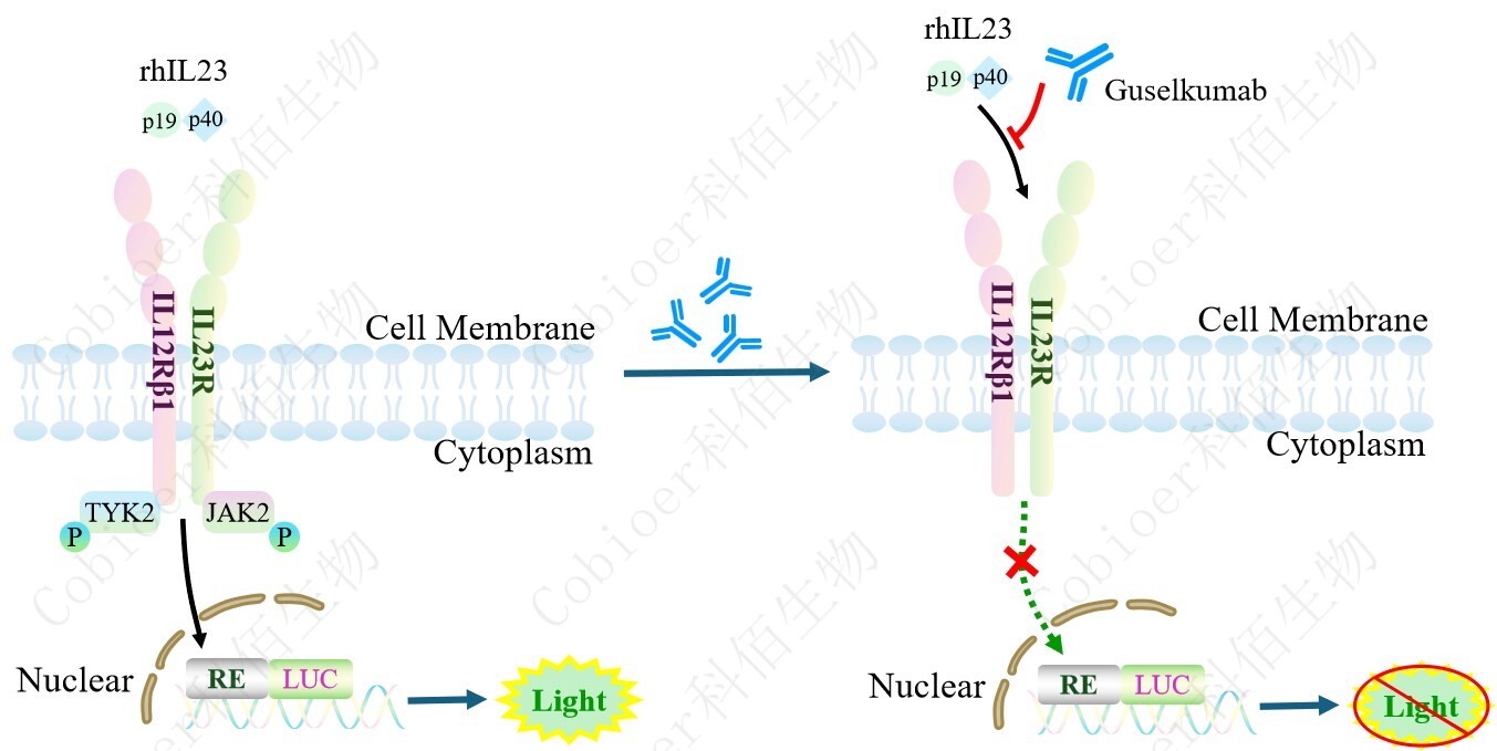 IL23 Effector Reporter Cell 報(bào)告基因藥靶模型很好的模擬了體內(nèi) IL23 的信號(hào)轉(zhuǎn)導(dǎo)過程, 原理見下圖所示。 ![]() Figure 1. IL23 Effector Reporter Cell 細(xì)胞模型原理圖
