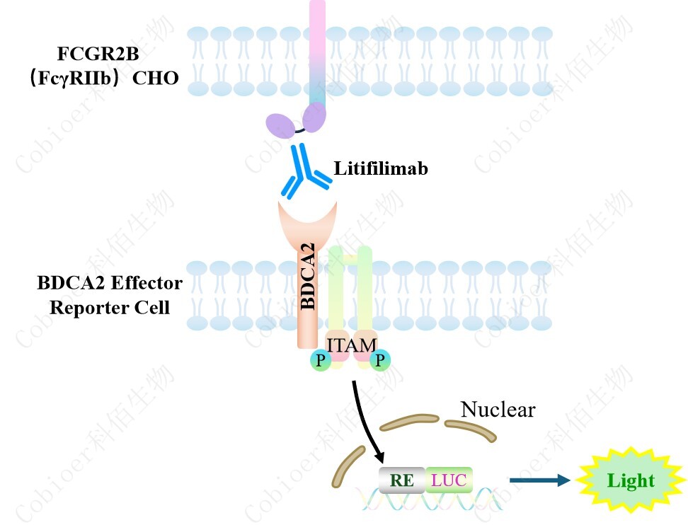BDCA2 Effector Reporter 報(bào)告基因藥靶模型很好的模擬了體內(nèi) BDCA2 的信號(hào)轉(zhuǎn)導(dǎo)過程, 原理見下圖 所示。![]() Figure 1. BDCA2 Effector Reporter 細(xì)胞模型原理圖