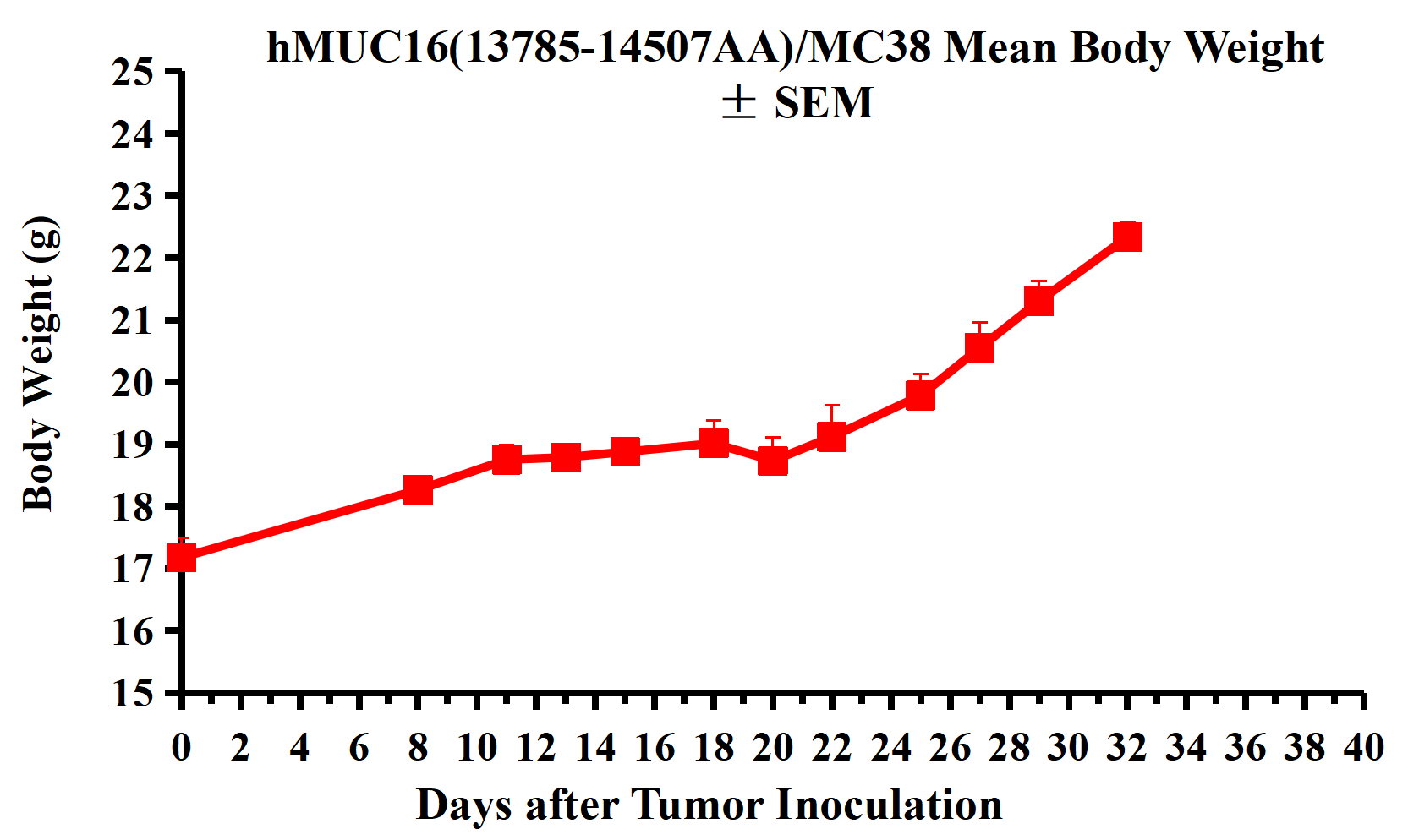 Figure 2. hMUC16(13785-14507AA)/MC38 Mean Body Weight ± SEM.