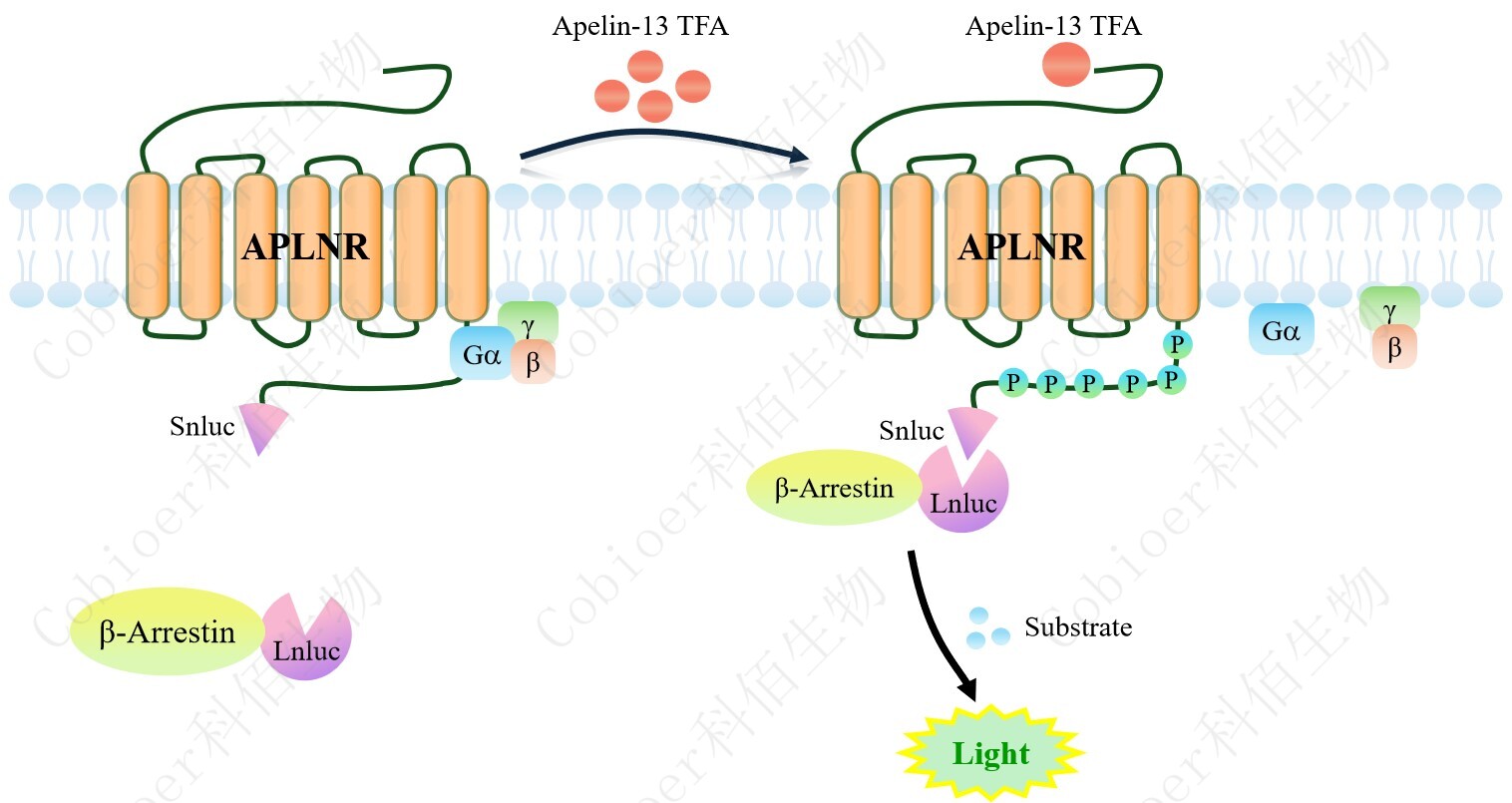 APLNR(APJ) β-Arrestin CHO 報告基因藥靶模型很好的模擬了體內(nèi) APLNR(APJ) /β-Arrestin 的信號轉(zhuǎn)導(dǎo)過程,原理見下圖所示。當(dāng)缺乏配體刺激時,β-Arrestin 不與 APLNR (APJ)結(jié)合,融合β-Arrestin 的熒光素酶處于失活構(gòu)象,當(dāng) APLNR(APJ)遭遇配體刺激 時,融合熒光素酶報告基因的β-Arrestin 被招募,使熒光素酶報告基因處于激活狀態(tài),加入 其底物后發(fā)光信號增強(qiáng)。![]() Figure 1. APLNR(APJ) β-Arrestin CHO 細(xì)胞模型原理圖 |
