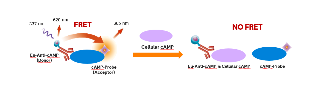 Cellular cyclic AMP Detection KIT是一種競(jìng)爭(zhēng)性的檢測(cè)技術(shù),檢測(cè)細(xì)胞內(nèi)cAMP的量。藥物同貼壁細(xì)胞或者懸浮細(xì)胞共處理后,能通過此KIT檢測(cè)出藥物對(duì)細(xì)胞的作用。 檢測(cè)原理采用TR-FRET檢測(cè)技術(shù)。細(xì)胞內(nèi)天然的cAMP同cAMP-Probe競(jìng)爭(zhēng)性結(jié)合Eu -Anti-cAMP。最終檢測(cè)出來(lái)的信號(hào)與樣本中cAMP的濃度成反比。