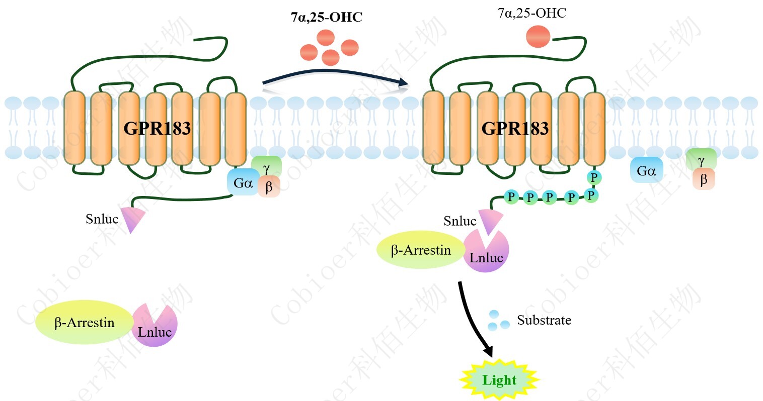 GPR183(EBI2) β-Arrestin CHO 報(bào)告基因藥靶模型很好的模擬了體內(nèi) GPR183(EBI2)/β- Arrestin 的信號(hào)轉(zhuǎn)導(dǎo)過程,原理見下圖所示。當(dāng)缺乏配體刺激時(shí),β-Arrestin不與 GPR183(EBI2) 結(jié)合,融合β-Arrestin 的熒光素酶處于失活構(gòu)象,當(dāng)GPR183(EBI2)遭遇配體 刺激時(shí),融合熒光素酶報(bào)告基因的β-Arrestin 被招募,使熒光素酶報(bào)告基因處于激活狀態(tài), 加入其底物后發(fā)光信號(hào)增強(qiáng)。