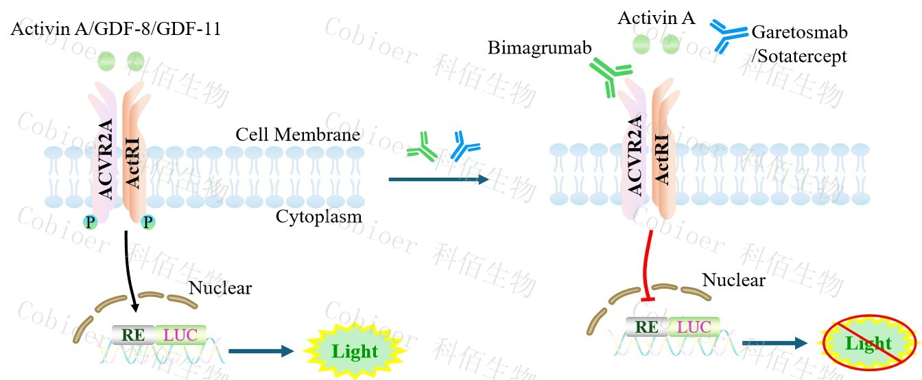 ACVR2A Effector Reporter Cell 報(bào)告基因藥靶模型很好的模擬了體內(nèi) ACVR2A 的信號(hào) 轉(zhuǎn)導(dǎo)過(guò)程,原理見(jiàn)下圖所示。