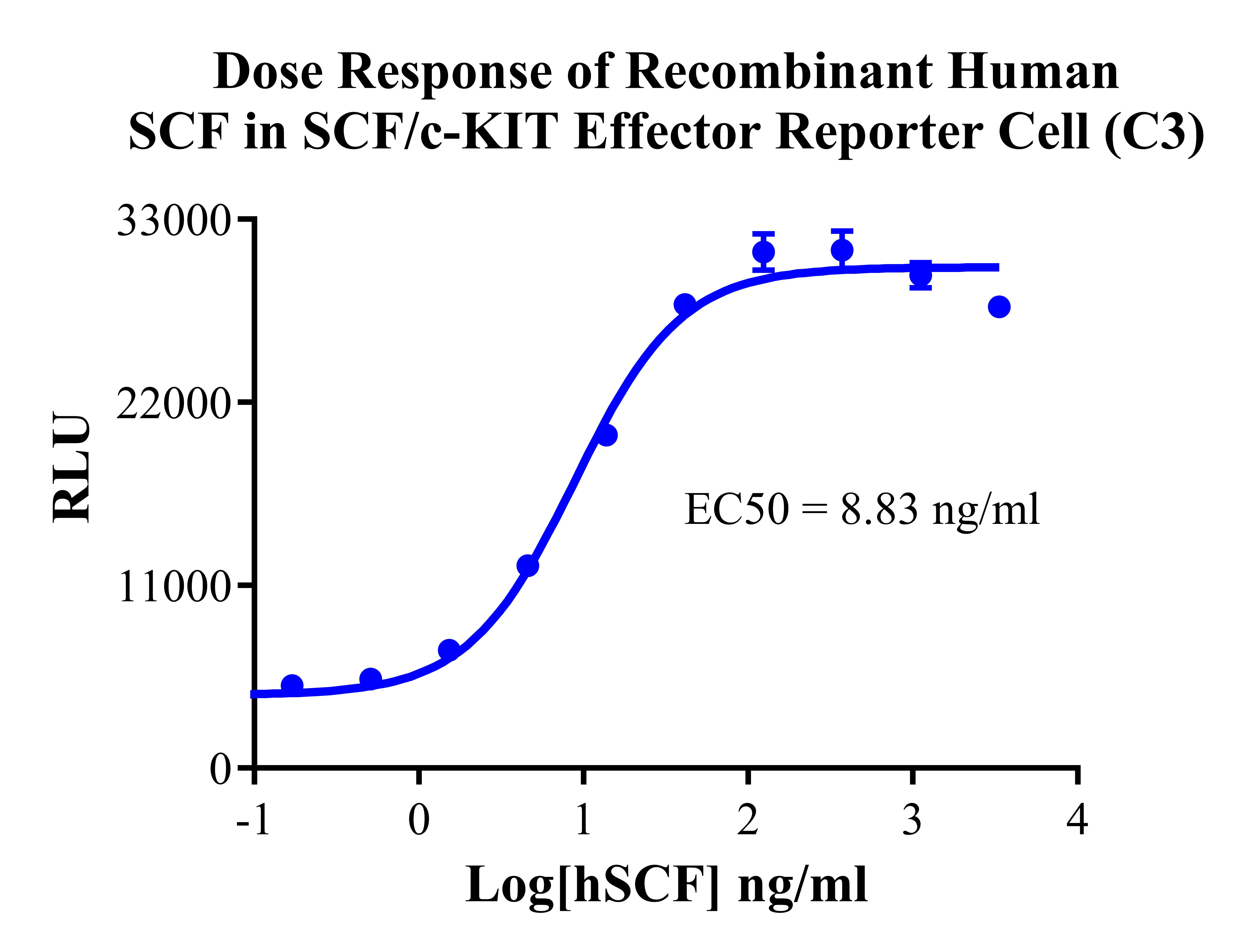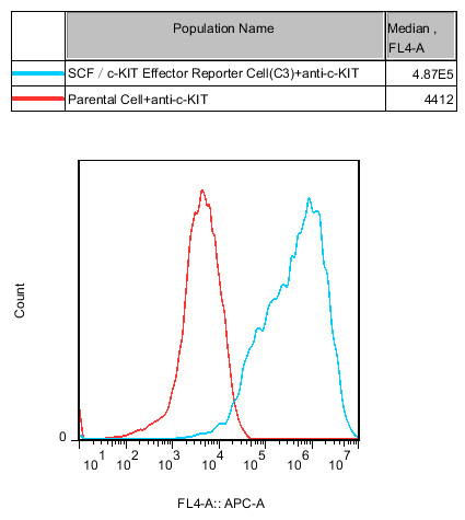 IV. Representative Data![]() Figure 2. Recombinant SCF/c-KIT Effector Reporter Cell stably expressing c-KIT. ![]() Figure 3. Dose Response of Recombinant Human SCF in SCF/c-KIT Effector Reporter Cell(C3). ![]() Figure 4. Inhibition of Human SCF-induced Reporter Activity by c-KIT Blocking Ab in SCF/c-KIT Effector Reporter Cell (C3). |