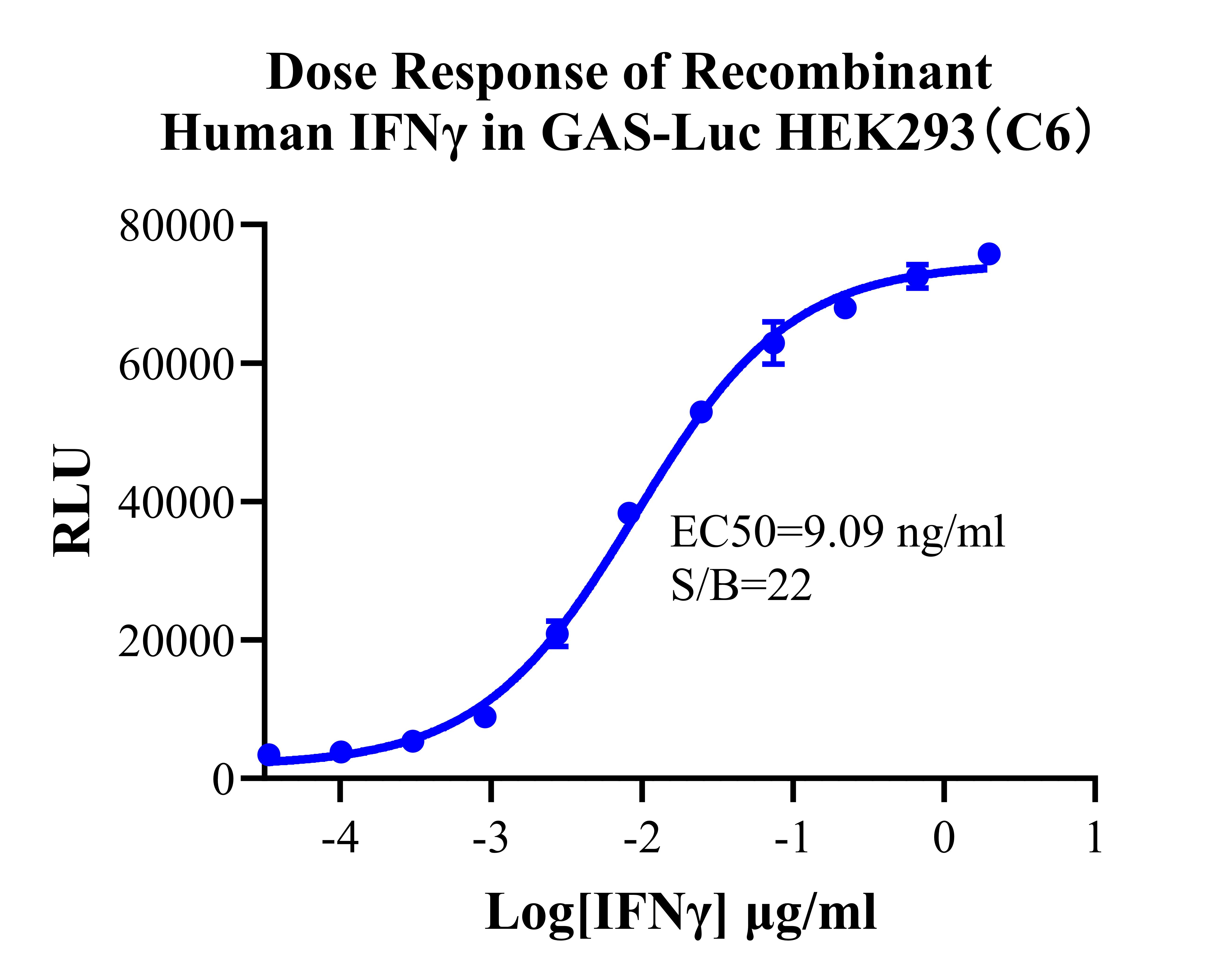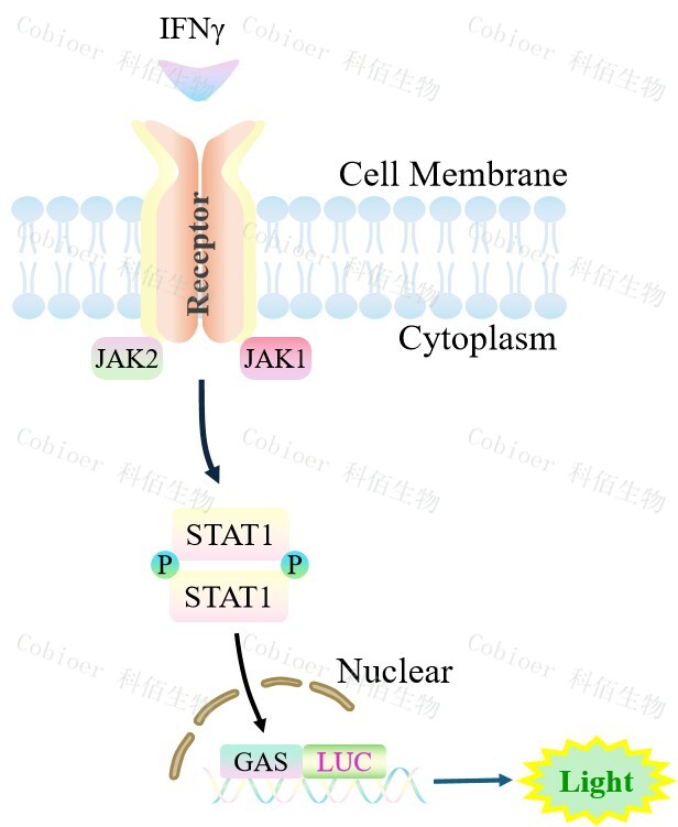 GAS-Luc HEK293 報告基因細胞,是由 GAS 調(diào)控并表達 Luc 熒光素酶 報告基因的 HEK293 細胞。IFNγ與受體結(jié)合,激活 GAS 的原理見下圖所示。