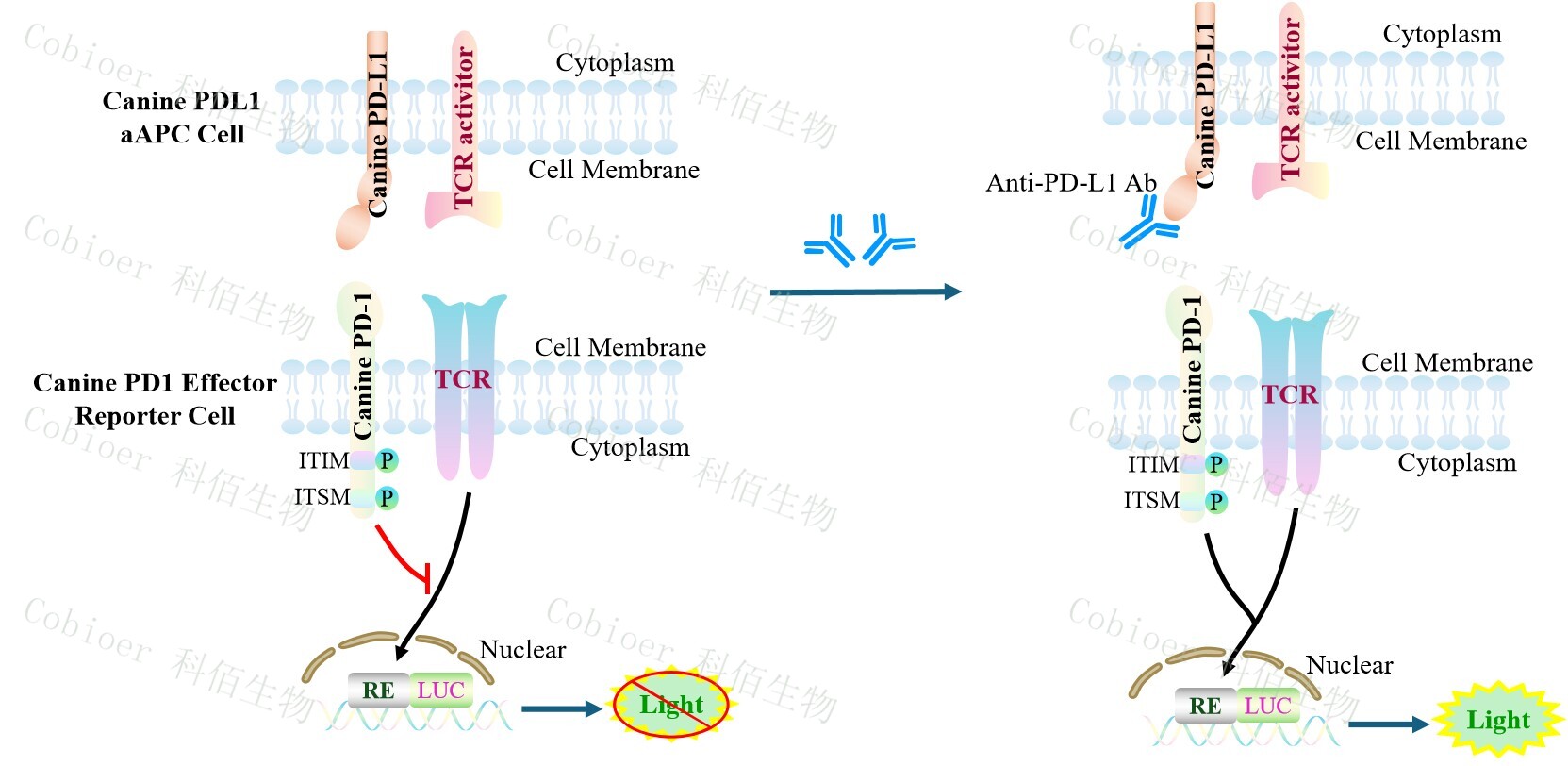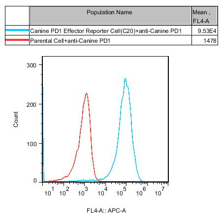 Canine PD1 Effector Reporter Cell 報告基因藥靶模型很好的模擬了體內(nèi) PD1&PDL1 的 信號轉(zhuǎn)導(dǎo)過程,原理圖見下圖所示。![]() Figure 1. Canine PD1 Effector Reporter Cell 細胞模型原理圖