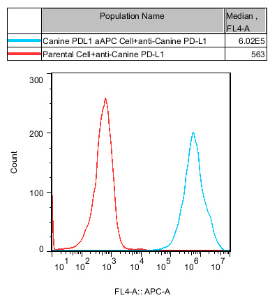 Canine PDL1 aAPC Cell 作為 Canine PD1 Effector Reporter Cell 的靶細(xì)胞,Canine PDL1 aAPC Cell 藥靶模型很好的模擬了體內(nèi) PD1&PDL1 的信號(hào)轉(zhuǎn)導(dǎo)過(guò)程,原理見(jiàn)下圖所示。![]() Figure 1. Canine PDL1 aAPC Cell 細(xì)胞模型原理圖 |