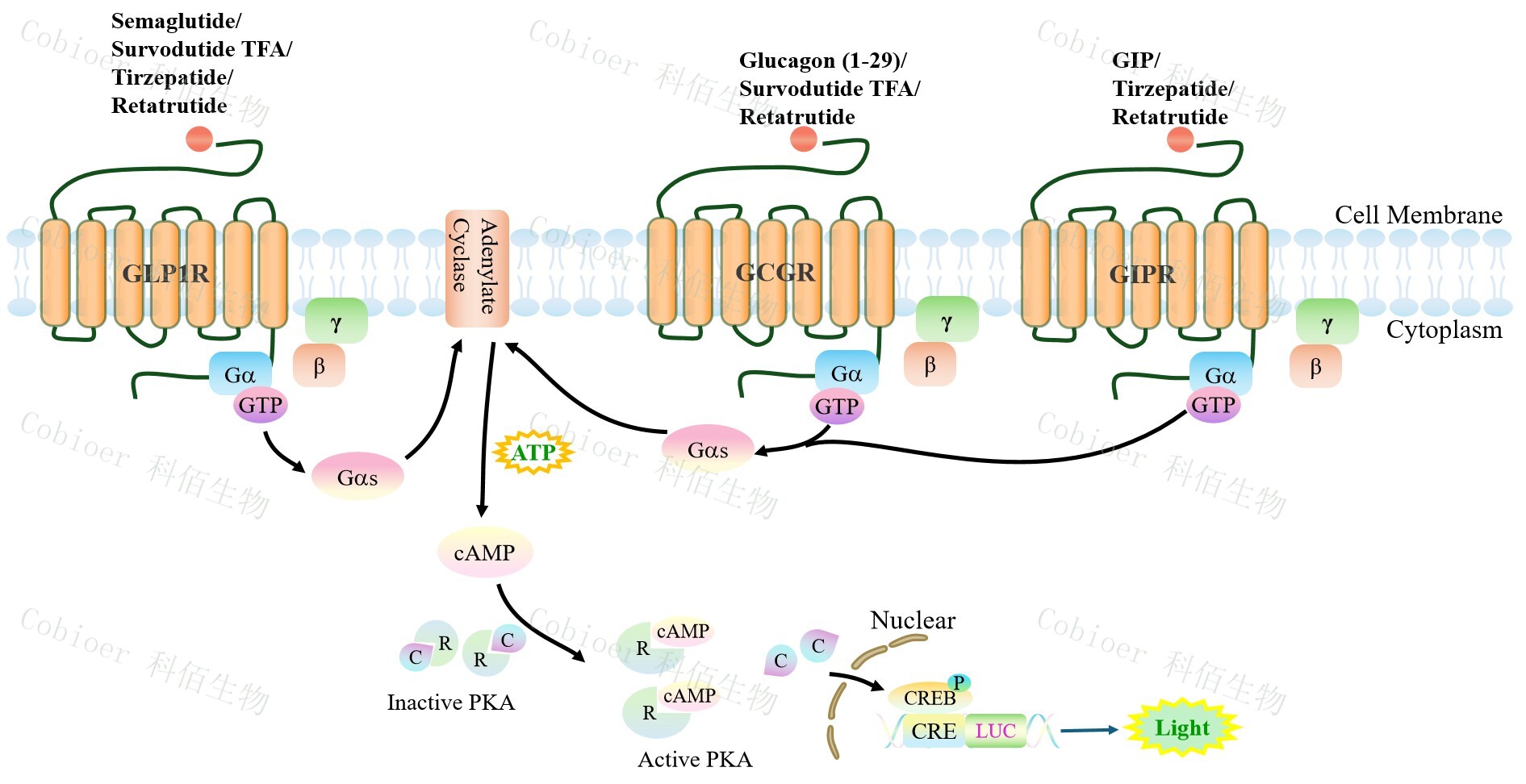 Figure 1. GLP1R&GCGR&GIPR Triple Reporter Cell 細胞模型原理圖