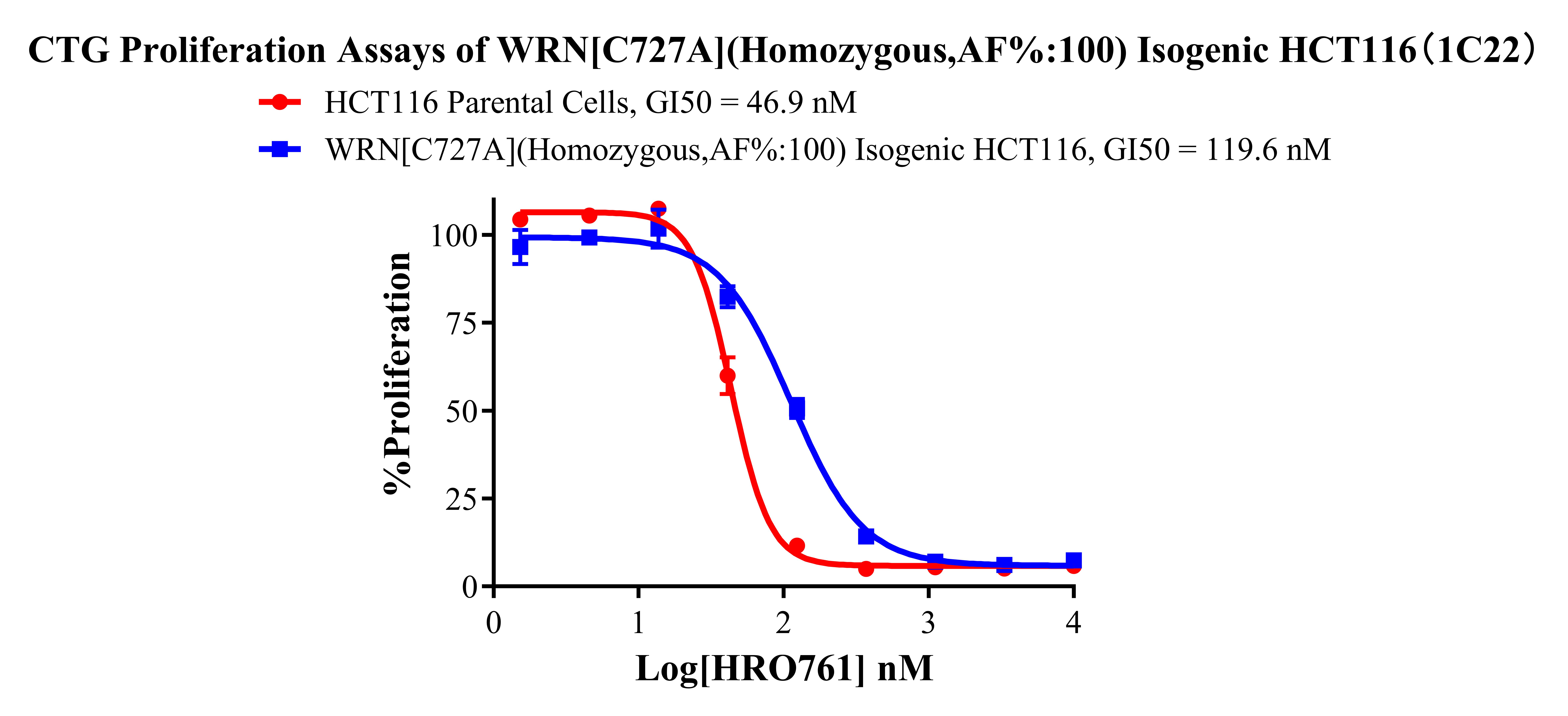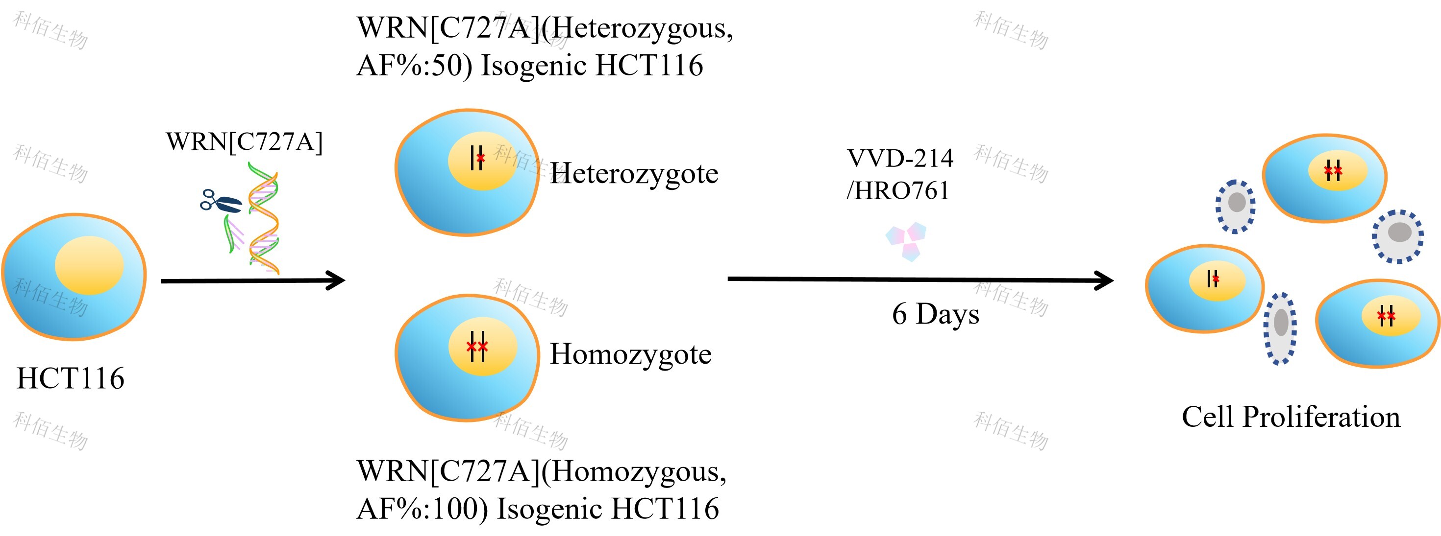 WRN[C727A](Homozygous,AF%:100) Isogenic HCT116 藥靶細(xì)胞,通過 基因編輯的方式將 WRN 的 727 位氨基酸胱氨酸(C)突變?yōu)楸彼幔ˋ)。![]() Figure 1. WRN[C727A](Homozygous,AF%:100) Isogenic HCT116 原理示意圖 |