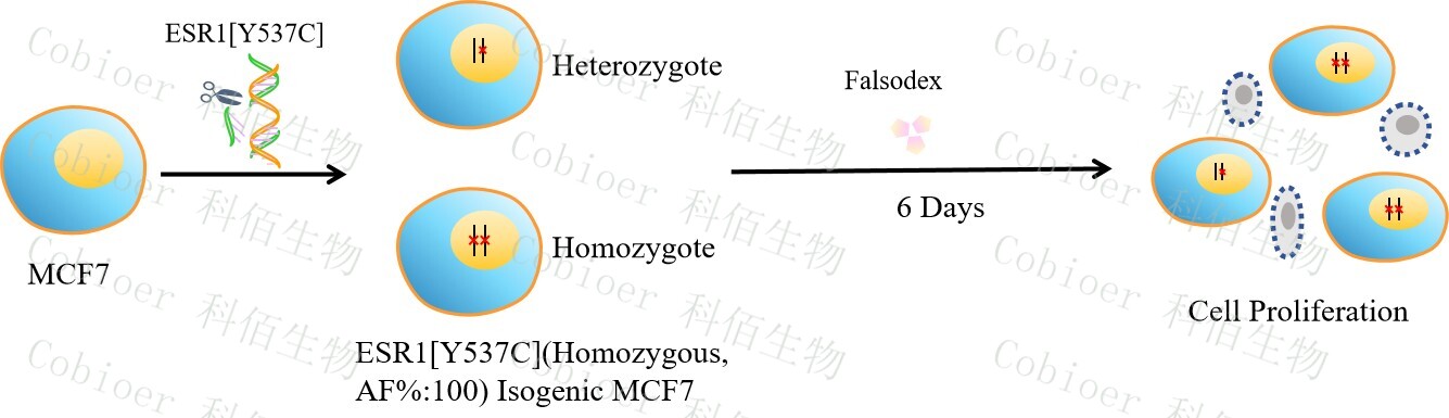 ESR1[Y537C](Homozygous,AF%:100) Isogenic MCF7 藥靶細(xì)胞,通過基因編輯的方式將 ESR1 的 537 位氨基酸酪氨酸(Y)突變?yōu)榘腚装彼幔–)。![]() Figure 1. ESR1[Y537C](Homozygous,AF%:100) Isogenic MCF7 原理示意圖 |