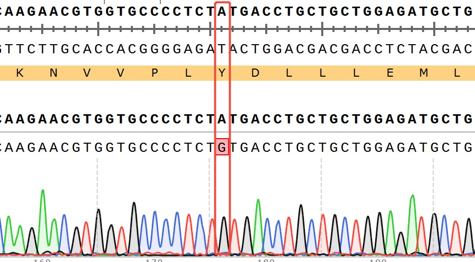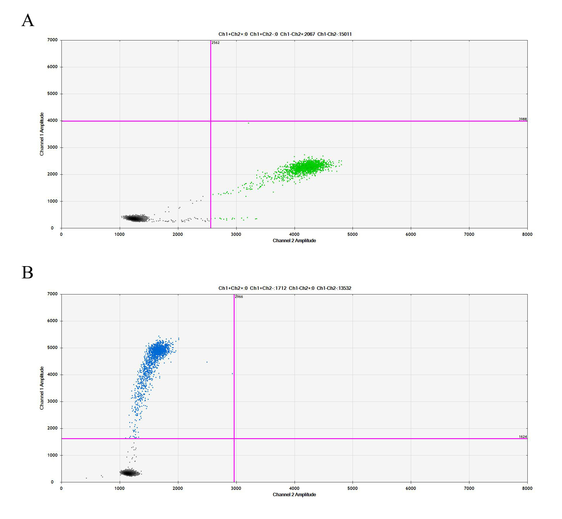 ![]() Figure 2. Sanger of ESR1[Y537C](Homozygous,AF%:100) Isogenic MCF7. ![]() Figure 3. A: MCF7 Parental Cell;B:ESR1[Y537C](Homozygous,AF%:100) Isogenic MCF7 通道2 藍(lán)色微滴代表ESR1[Y537C]突變陽性,通道2 綠色微滴代表該位點為陰性野生型 ![]() Figure 4. CTG Proliferation Assay of ESR1[Y537C](Homozygous,AF%:100) lsogenic MCF7(2C40). |