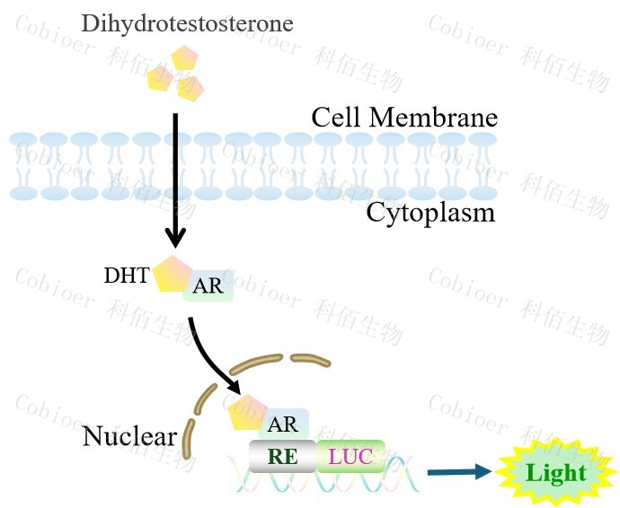 AR Reporter LNCAP Cell(DHT low sensitive)藥靶細胞,在由調(diào)控因子調(diào) 控并表達報告基因的重組細胞上,穩(wěn)定表達人 AR。雄激素的代謝產(chǎn)物 DHT(雙氫睪酮) 會與細胞上的 AR 結(jié)合,激活 AR 信號通路,原理見下圖所示。