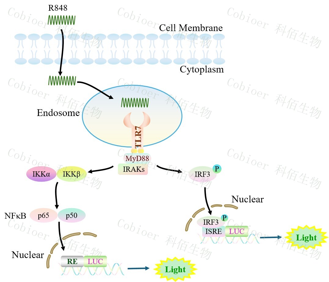 TLR7 NFκB&ISRE Dual Reporter Cell 報(bào)告基因藥靶模型很好的模擬了體內(nèi) TLR7 的信號(hào)轉(zhuǎn)導(dǎo)過(guò)程,原理見(jiàn)下圖所示。![]() Figure 1. TLR7 NFκB&ISRE Dual Reporter Cell 細(xì)胞模型原理圖 |