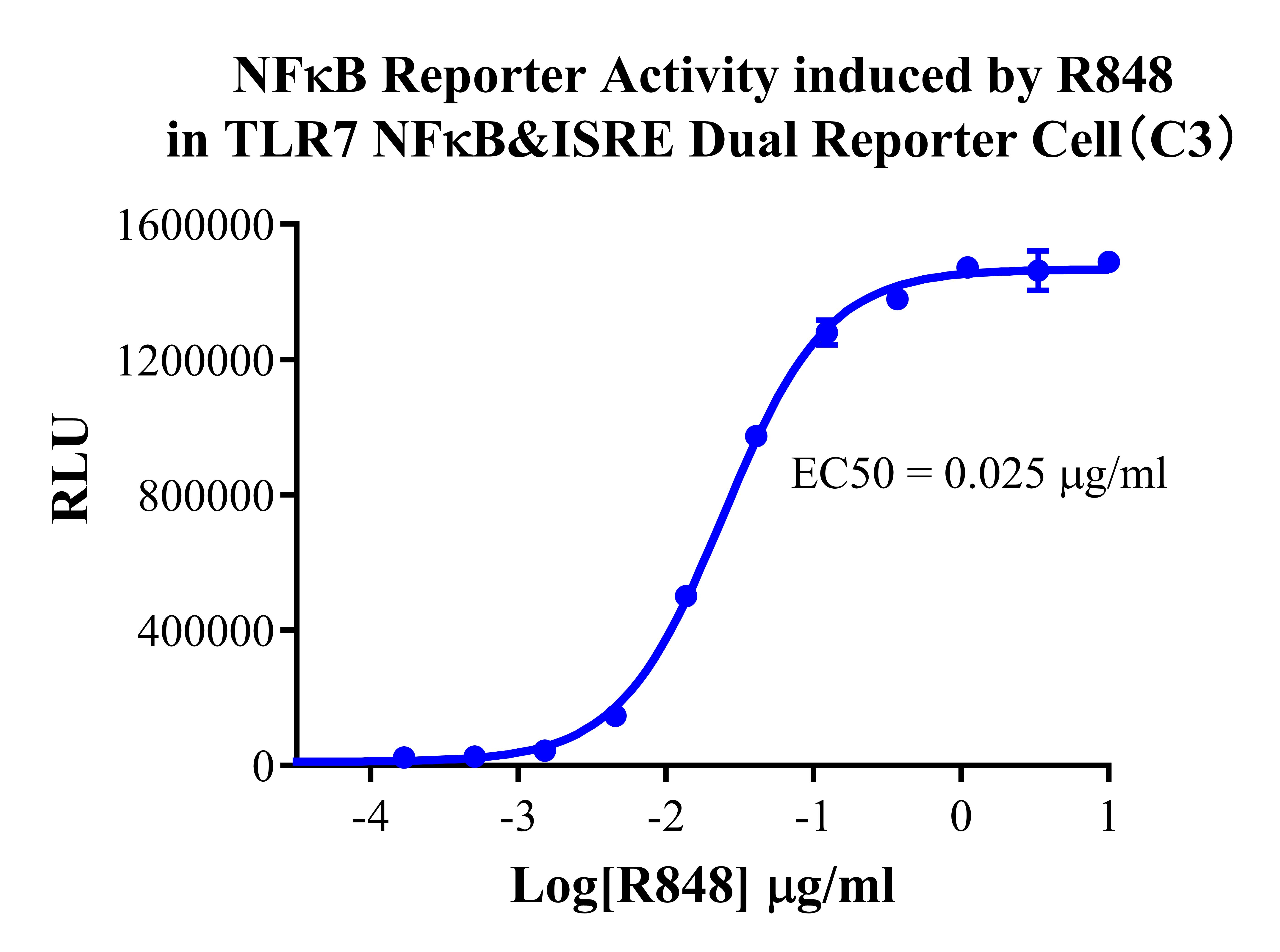 ![]() Figure 2.NFκB Reporter Activity induced by R848 in TLR7 NFκB&ISRE Dual Reporter Cell(C3). ![]() Figure 3. ISRE Reporter Activity induced by R848 in TLR7 NFκB&ISRE Dual Reporter Cell(C3). |