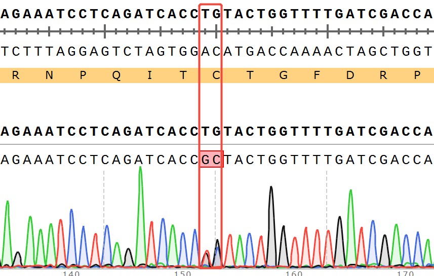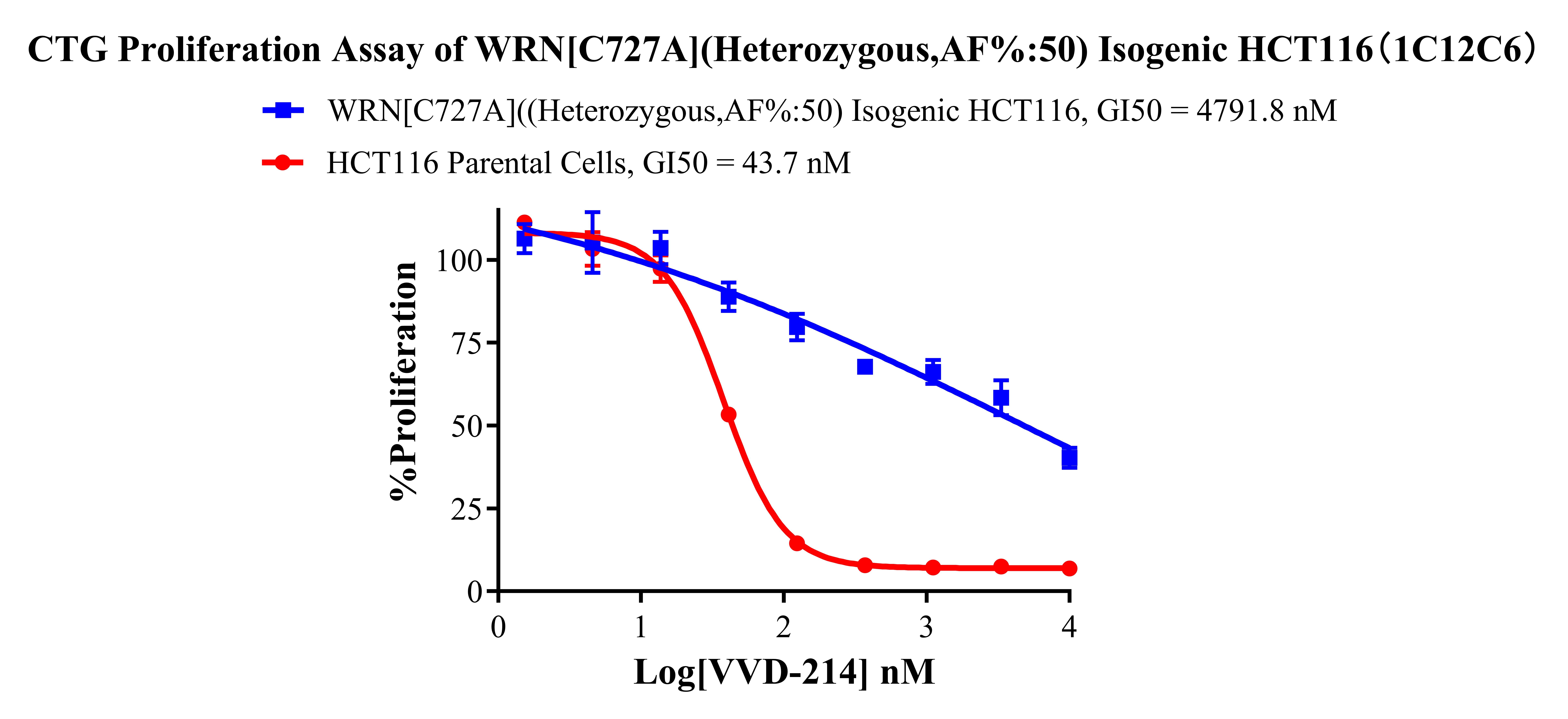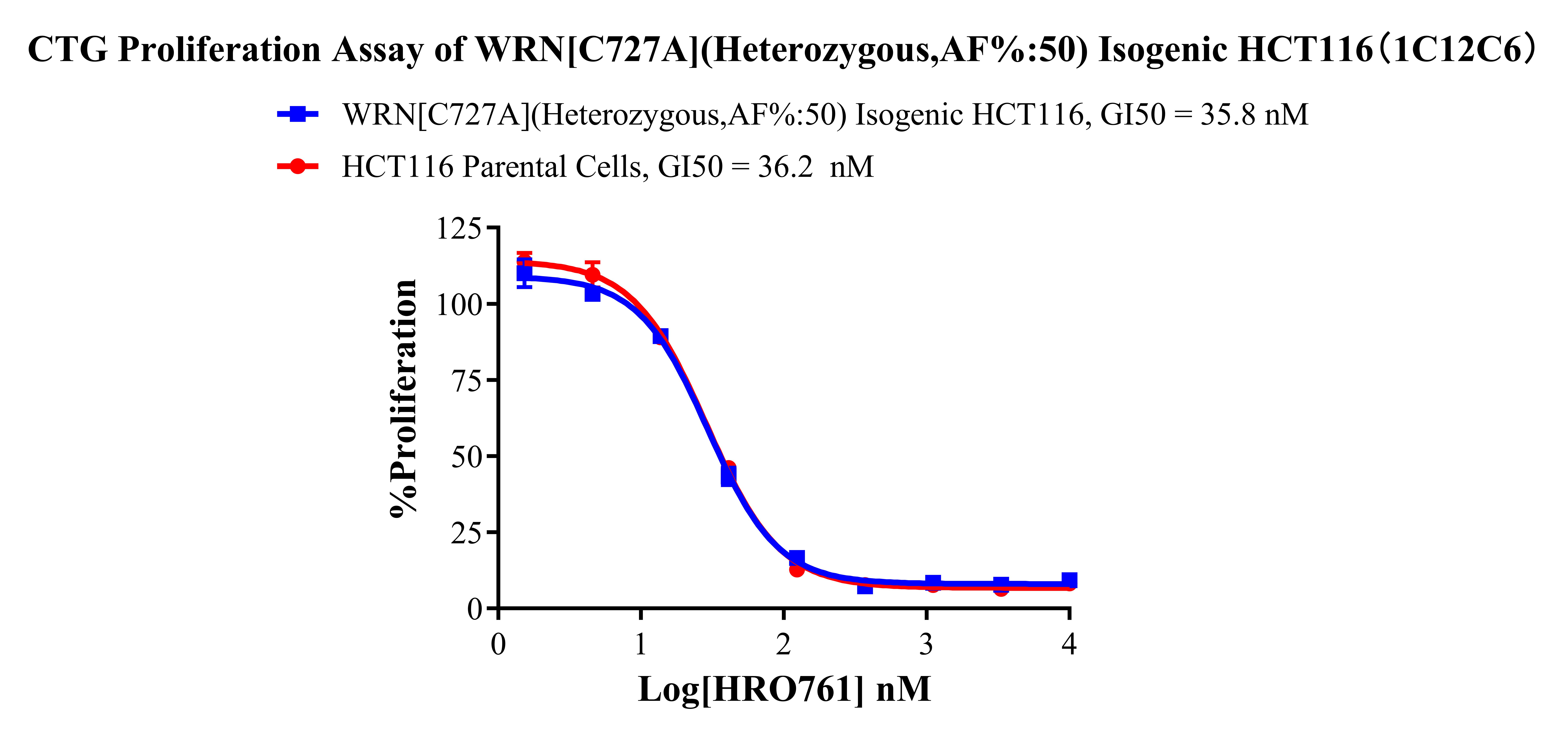 WRN[C727A](Heterozygous,AF%:50) Isogenic HCT116 藥靶細胞,通過基 因編輯的方式將 WRN 的 727 位氨基酸胱氨酸(C)突變?yōu)楸彼幔ˋ)。![]() Figure 1. WRN[C727A](Heterozygous,AF%:50) Isogenic HCT116 原理示意圖 |