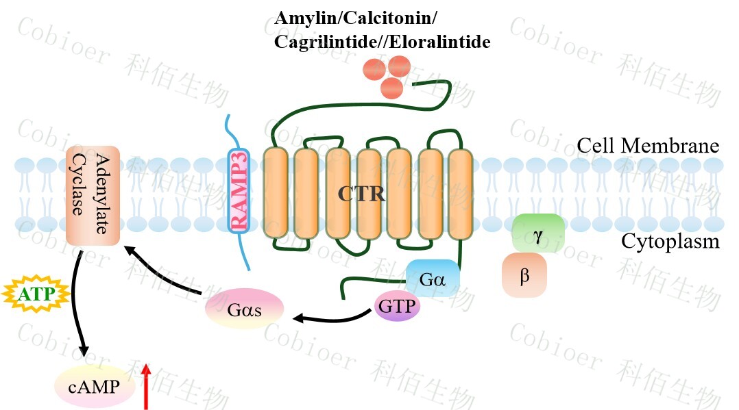 | 降鈣素基因相關(guān)肽(CGRP)家族包括 CGRP 本身、降鈣素(CT)、腎上腺髓質(zhì)素 (AM)和胰島淀粉樣肽(AMY)。 胰淀素(Amylin)受體的三種類型的已被確定,即 AMY1,AMY2 和 AMY3。胰淀素 受體屬于 B 類 GPCR,是異二聚體復(fù)合物,由降鈣素受體(CTR)與受體活性修飾蛋白 (RAMPs)結(jié)合形成。該受體的 CTR 組分具有相同的 GPCR 結(jié)構(gòu):7 個(gè)跨膜相互連接的α- 螺旋,將細(xì)胞外信號(hào)傳遞到細(xì)胞內(nèi)細(xì)胞質(zhì)信號(hào)級(jí)聯(lián)。RAMP 有三種類型(RAMP1、 RAMP2 和 RAMP3),它們共享 31%的氨基酸序列,具有相似的基本結(jié)構(gòu)。RAMP 是將 CTR 轉(zhuǎn)運(yùn)到細(xì)胞膜并調(diào)節(jié)其配體特異性的重要肽,它可以改變特定 GPCR 的藥理學(xué)、功能 和細(xì)胞運(yùn)輸。 哺乳動(dòng)物細(xì)胞中 Amylin 受體的激活已被證明可以提高 cAMP,并被認(rèn)為與 Gs 蛋白和 腺苷酸環(huán)化酶的刺激有關(guān)。在 RAMPs 的存在下,其與胰淀素的結(jié)合親和力可以被修飾。 CTR 和 RAMP1 或 CTR 和 RAMP3 的異質(zhì)結(jié)構(gòu)被認(rèn)為有利于與胰淀素結(jié)合,介導(dǎo)大腦中的 生理功能。AMY3 的激活刺激 G 蛋白 Gαs,進(jìn)一步控制腺苷酸環(huán)化酶(AC),隨后增加細(xì) 胞 cAMP。cAMP 與 PKA 調(diào)控亞基(R2)的結(jié)合誘導(dǎo) PKA 四聚體全酶解離,導(dǎo)致 PKA 催 化亞基的激活。cAMP 激活的 PKA 參與調(diào)控 ERK1/2 的活性。ERK1/2 通路的觸發(fā)可能導(dǎo)致 Ca 2+分布不均勻,引發(fā)內(nèi)質(zhì)網(wǎng)和線粒體功能障礙,導(dǎo)致細(xì)胞死亡。此外,cAMP 刺激 AKT 進(jìn)一步導(dǎo)致轉(zhuǎn)錄因子 cFos 的表達(dá)。 |