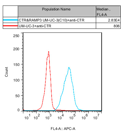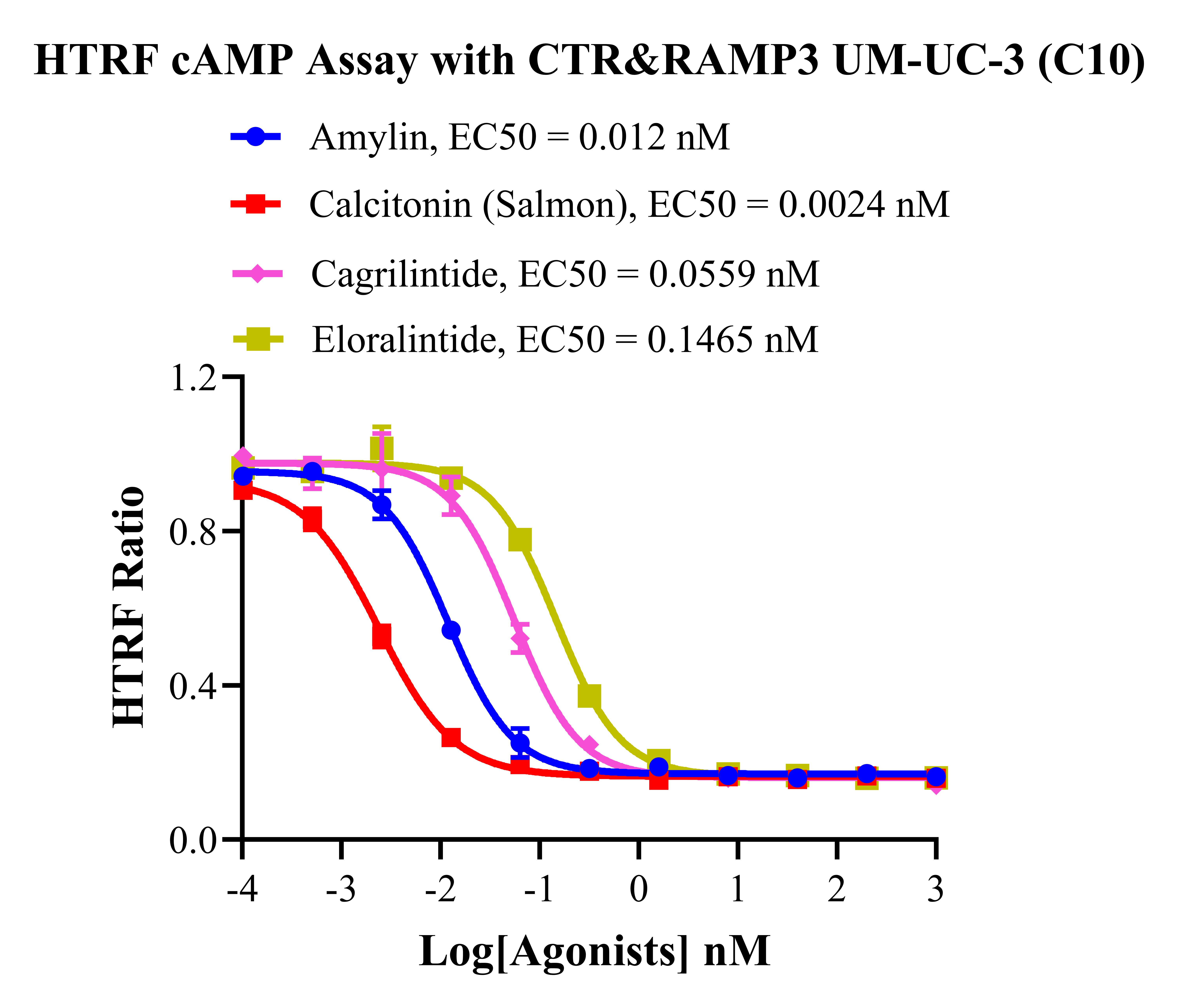 CTR&RAMP3 UM-UC-3 細(xì)胞藥靶模型很好的模擬了體內(nèi) CTR&RAMP3 的信號(hào)轉(zhuǎn)導(dǎo)過程,原理見下圖所示。![]() Figure 1. CTR&RAMP3 UM-UC-3 細(xì)胞模型原理圖 |