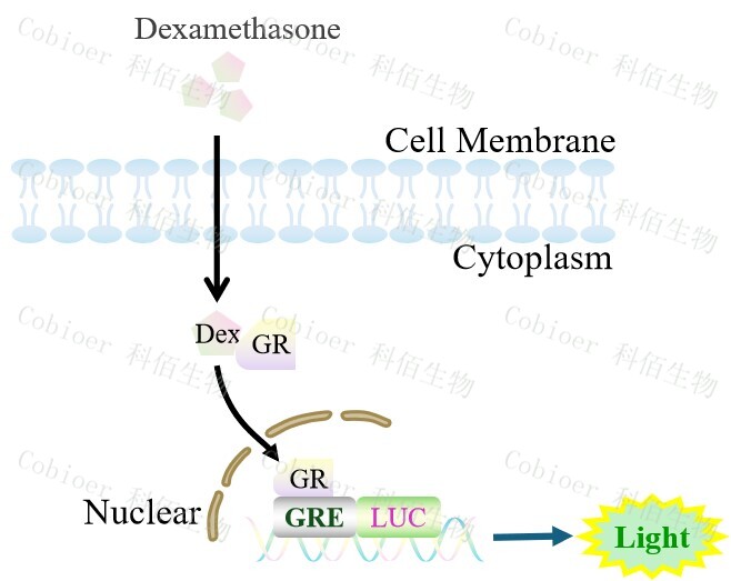GRE-Luc HEK293 報(bào)告基因細(xì)胞,是由 GRE 調(diào)控并表達(dá) Luc 熒光素酶 報(bào)告基因的 HEK293 細(xì)胞。Dexamethasone (Hexadecadrol,地塞米松)是糖皮質(zhì)激素受體 (Glucocorticoid Receptor)激動(dòng)劑、凋亡誘導(dǎo)劑,原理見下圖所示。![]() Figure 1. GRE-Luc HEK293 細(xì)胞原理示意圖 |