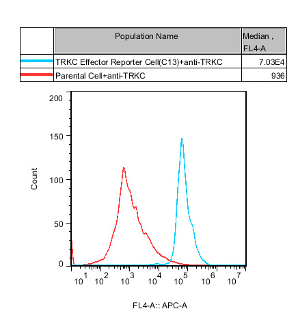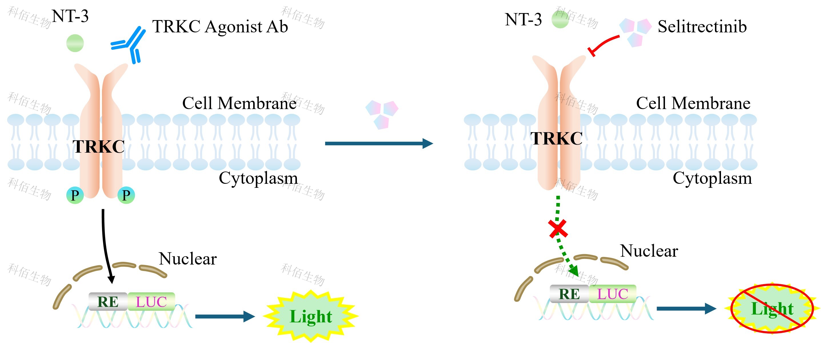 TRKC Effector Reporter Cell 報(bào)告基因藥靶模型很好的模擬了體內(nèi) TRKC 的信號(hào)轉(zhuǎn)導(dǎo)過程,原理見下圖所示。![]() Figure 1. TRKC Effector Reporter Cell 模型原理圖 |
