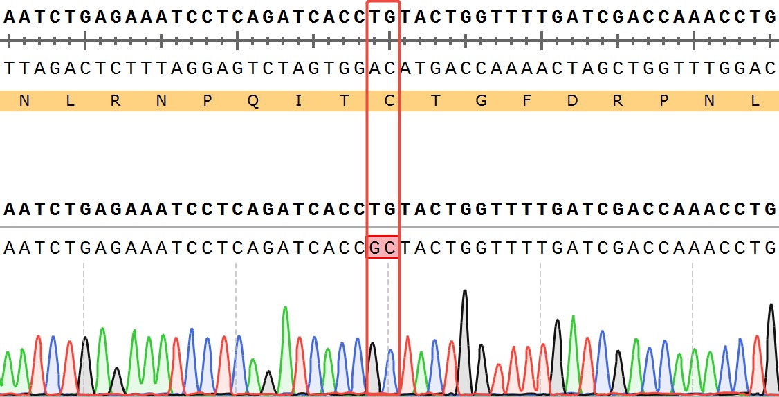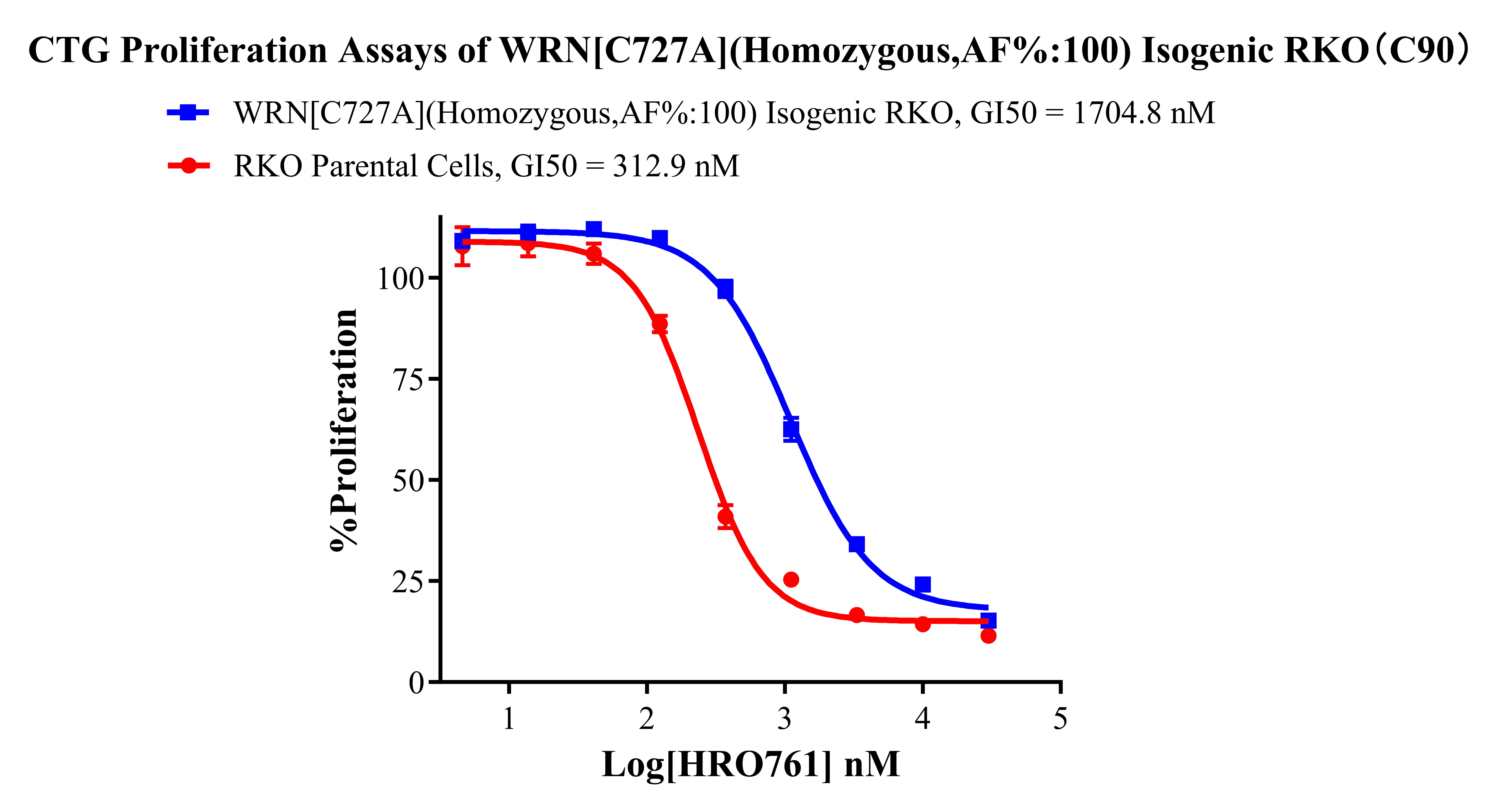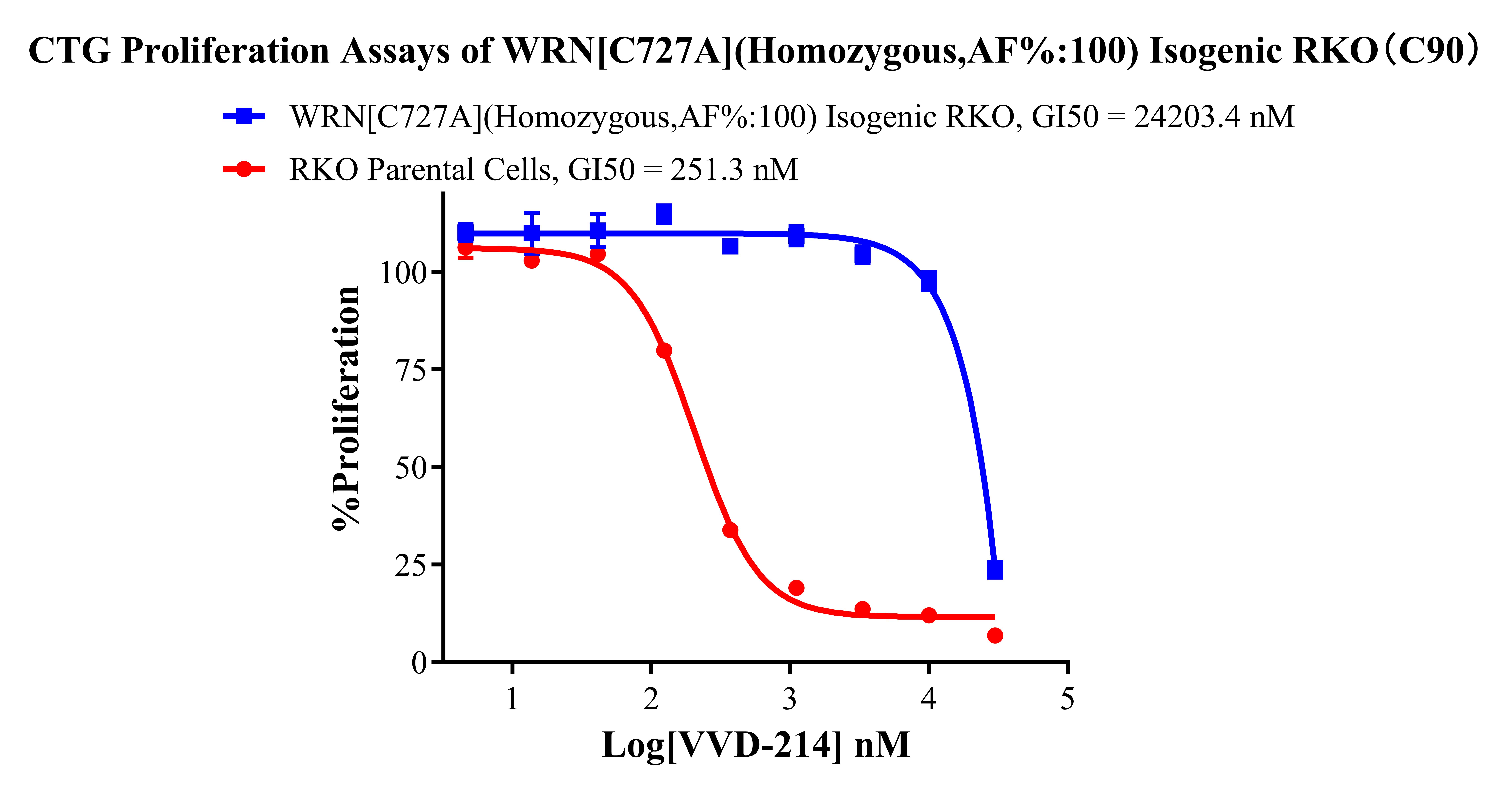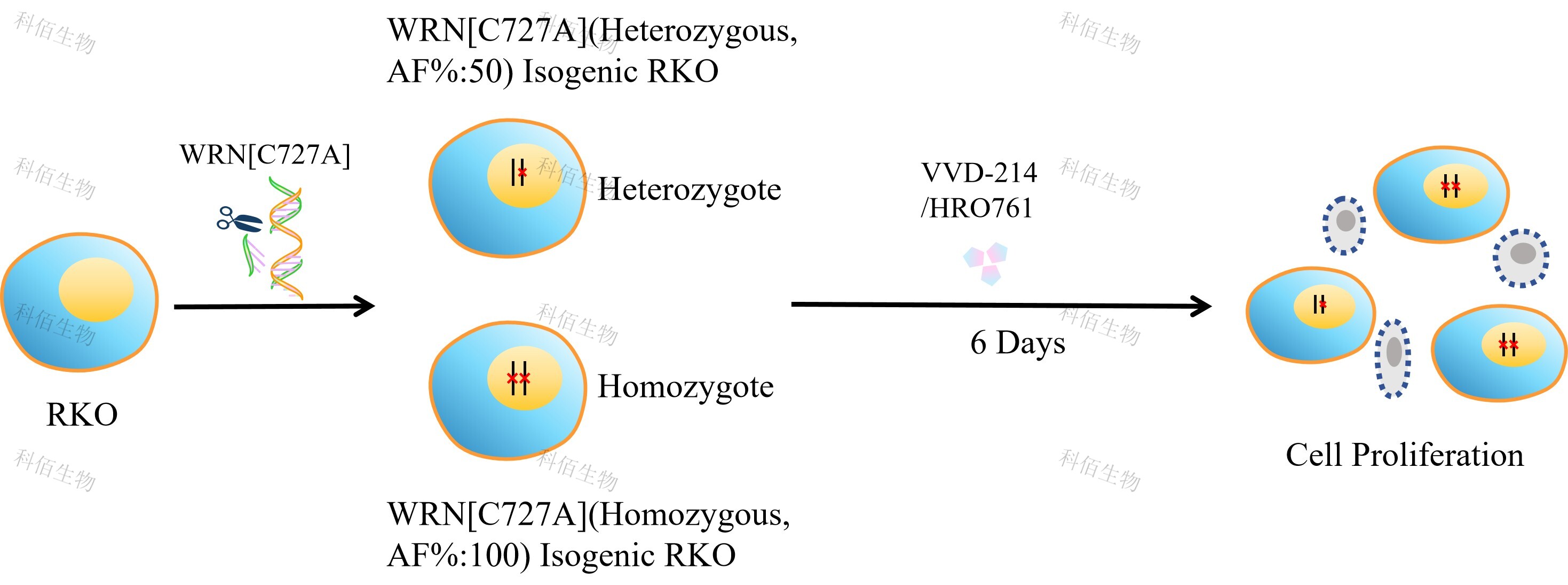 WRN[C727A](Homozygous,AF%:100) Isogenic RKO 藥靶細(xì)胞,通過基因 編輯的方式將 WRN 的 727 位氨基酸胱氨酸(C)突變?yōu)楸彼幔ˋ)。![]() Figure 1. WRN[C727A](Homozygous,AF%:100) Isogenic RKO 原理示意圖 |
