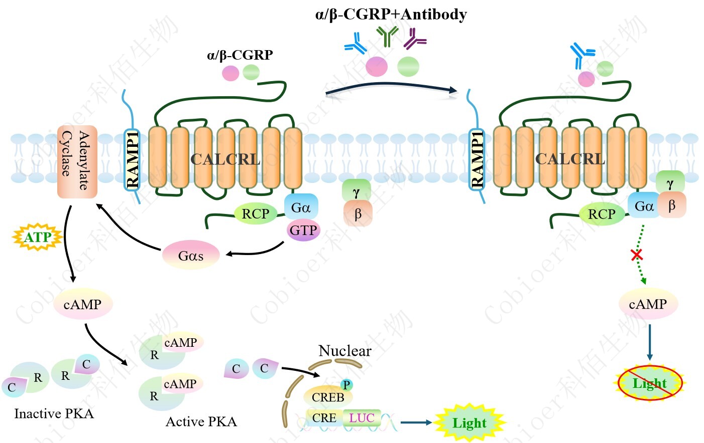 | 降鈣素基因相關(guān)肽(CGRP)家族包括 CGRP 本身、降鈣素(CT)、腎上腺髓質(zhì)素(AM)和 胰島淀粉樣肽(AMY)。 神經(jīng)肽降鈣素基因相關(guān)肽(CGRP)是中樞和外周神經(jīng)元產(chǎn)生的一種有效的血管擴張劑。 CGRP 在人體內(nèi)以α - CGRP 和β - CGRP 兩種形式存在。α - CGRP 和β - CGRP 都是受體的完 全激動劑。CGRP 通過 CGRP 受體介導(dǎo)其作用,CGRP 受體是一種異二聚體復(fù)合物:G 蛋 白偶聯(lián)受體 CALCRL 和單跨膜結(jié)構(gòu)域蛋白受體 RAMP1。功能 CGRP 受體所需的最后一個 成分是受體成分蛋白(RCP)。缺乏 RCP 已被證明會影響 CGRP 受體的激活,以環(huán)磷酸腺苷 (cAMP)的增加來衡量,而不影響配體的結(jié)合。受體的主要功能單元 CALCRL(也稱為 CLR 或 CRLR)可以連接到三種 RAMPs 中的一種,這三種 RAMPs 分別產(chǎn)生不同的受體。 RAMPs 是單跨膜蛋白,對受體功能至關(guān)重要,因為它們參與受體復(fù)合物向質(zhì)膜的易位,并 進一步提供配體結(jié)合的特異性。CALCRL 與 RAMP1 組成 CGRP 受體;RAMP2 是 AM 受 體,命名為 AM1;RAMP3 是 CGRP/AM 雙受體,命名為 AM2。RAMP1 亞基負責(zé) CGRP 與 CGRP 受體的特異性結(jié)合。 配體結(jié)合后,復(fù)合物與 G 蛋白相互作用,Gαs 亞基從復(fù)合物中分離并激活腺苷酸環(huán)化 酶,產(chǎn)生 cAMP。細胞內(nèi) cAMP 濃度升高刺激 cAMP 依賴的信號通路,最終導(dǎo)致轉(zhuǎn)錄因子 cAMP 應(yīng)答元件結(jié)合蛋白(CREB)與 CRE 啟動子結(jié)合,誘導(dǎo)基因表達。 |