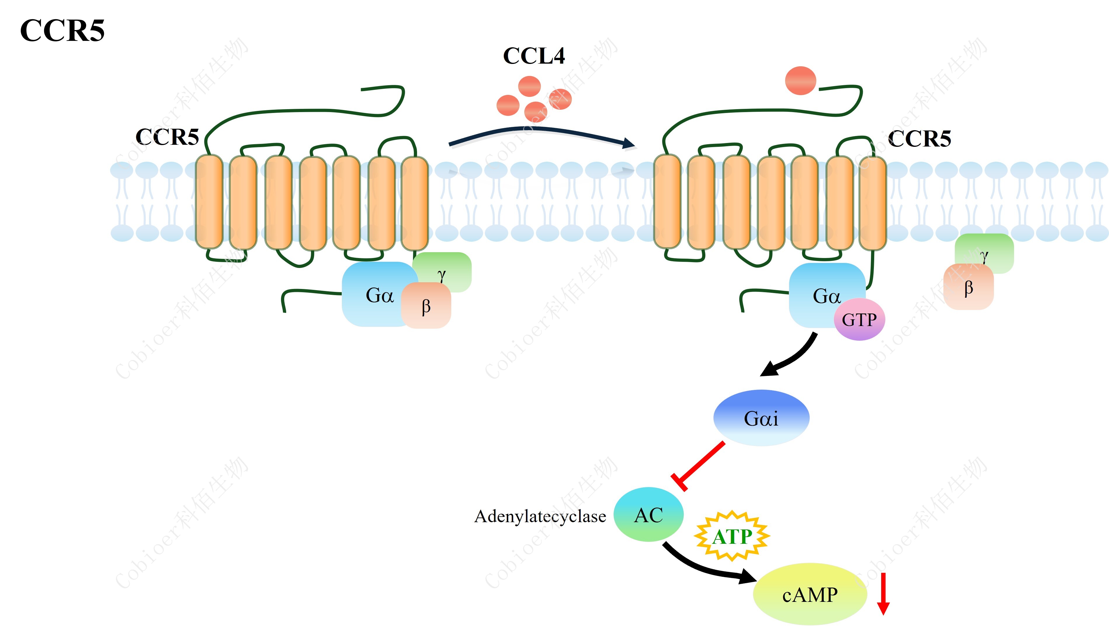 cAMP 在 G 蛋白偶聯(lián)受體(GPCR)信號(hào)轉(zhuǎn)導(dǎo)中是一種關(guān)鍵的第二信使。當(dāng)配體結(jié)合到 GPCR,構(gòu)象發(fā)生變化,激活受體接著激活G蛋白,Gi的激活導(dǎo)致腺苷酸環(huán)化酶調(diào)控 cAMP 的下調(diào)。CCR5 藥靶模型很好的模擬了體內(nèi) CCR5 的信號(hào)轉(zhuǎn)導(dǎo)過程,原理見下圖所示。![]() Figure 1. CCR5 CHO 細(xì)胞模型原理圖