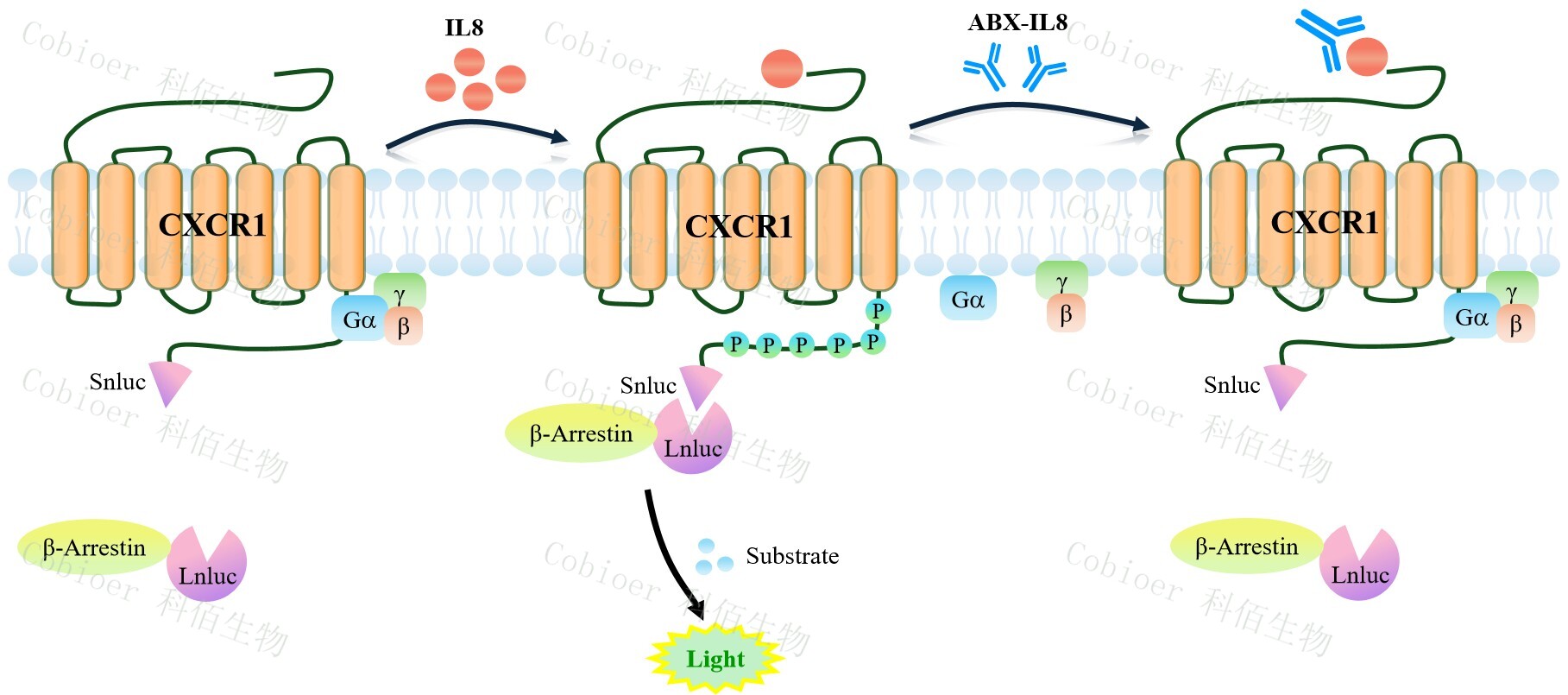 CXCR1 β-Arrestin CHO 報(bào)告基因藥靶模型很好的模擬了體內(nèi) CXCR1/β-Arrestin 的信號(hào)轉(zhuǎn)導(dǎo)過(guò)程,原理見下圖所示。當(dāng)缺乏配體刺激時(shí),β-Arrestin 不與 CXCR1 結(jié)合,融合β- Arrestin 的熒光素酶處于失活構(gòu)象,當(dāng) CXCR1 遭遇配體刺激時(shí),融合熒光素酶報(bào)告基因的 β-Arrestin 被招募,使熒光素酶報(bào)告基因處于激活狀態(tài),加入其底物后發(fā)光信號(hào)增強(qiáng)。![]() Figure 1. CXCR1 β-Arrestin CHO 細(xì)胞模型原理圖 |
