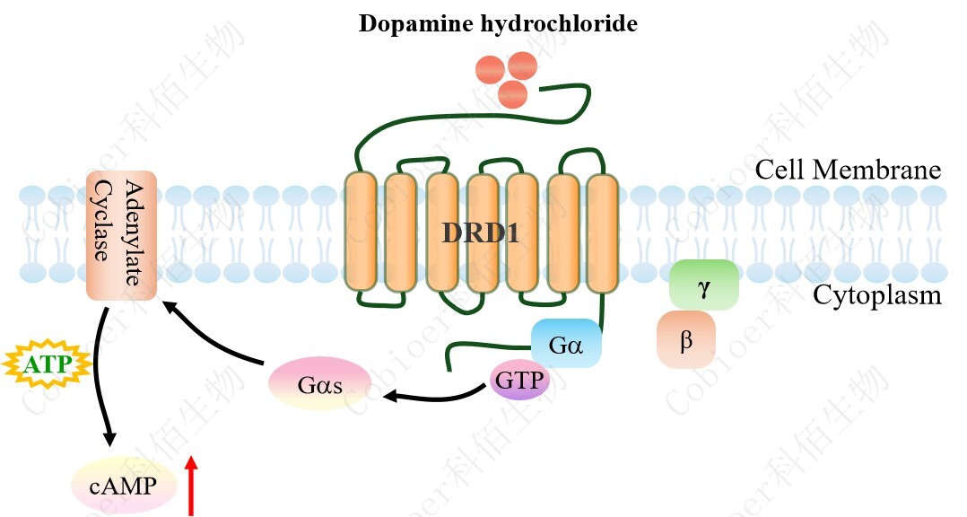 cAMP 在 G 蛋白偶聯(lián)受體(GPCR)信號(hào)轉(zhuǎn)導(dǎo)中是一種關(guān)鍵的第二信使。當(dāng)配體結(jié)合 到 GPCR,構(gòu)象發(fā)生變化,激活受體接著激活 G 蛋白,Gs 的激活導(dǎo)致腺苷酸環(huán)化酶調(diào)控 cAMP 的升高。DRD1 CHO 藥靶模型很好的模擬了體內(nèi) DRD1 的信號(hào)轉(zhuǎn)導(dǎo)過(guò)程,原理見(jiàn)下圖所示。![]() Figure 1. DRD1 CHO 細(xì)胞模型原理 |