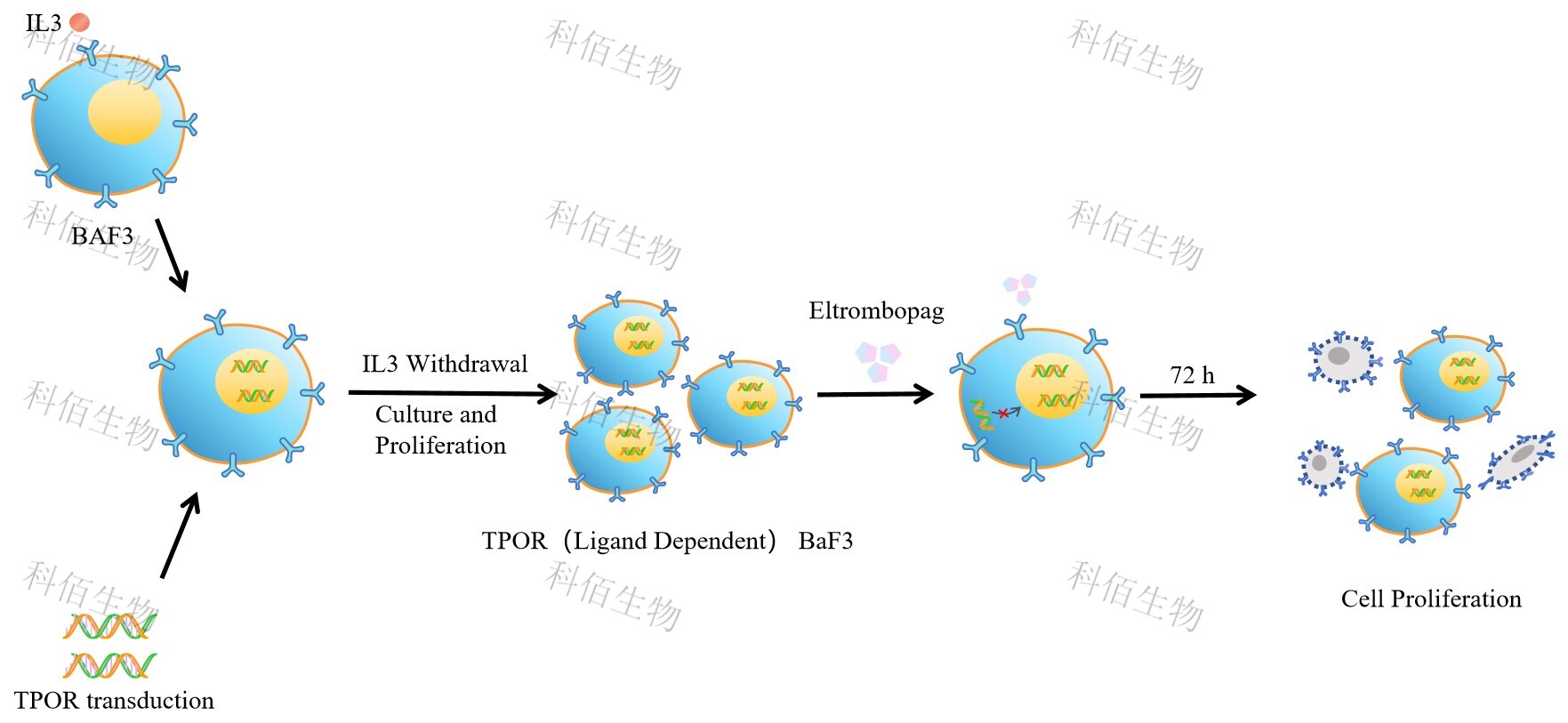 TPOR(Ligand Dependent) BaF3 藥靶細(xì)胞,通過(guò)轉(zhuǎn)導(dǎo)野生狀態(tài)的 TPOR 基 因到 BaF3 細(xì)胞系中,穩(wěn)定表達(dá)人野生形態(tài)下的 TPOR 基因。 BaF3(小鼠原 B 細(xì)胞)的生長(zhǎng)和增殖需要 IL-3 的維持。通過(guò)引入各種表達(dá)激酶的基因, 能作為 BaF3 的驅(qū)動(dòng)基因,讓 BaF3 不再依賴 IL-3 而增殖,進(jìn)而激酶基因成為 BaF3 增殖依賴的驅(qū)動(dòng)基因,用于評(píng)估小分子藥物對(duì)激酶的靶向抑制作用,原理及流程見下圖所示。