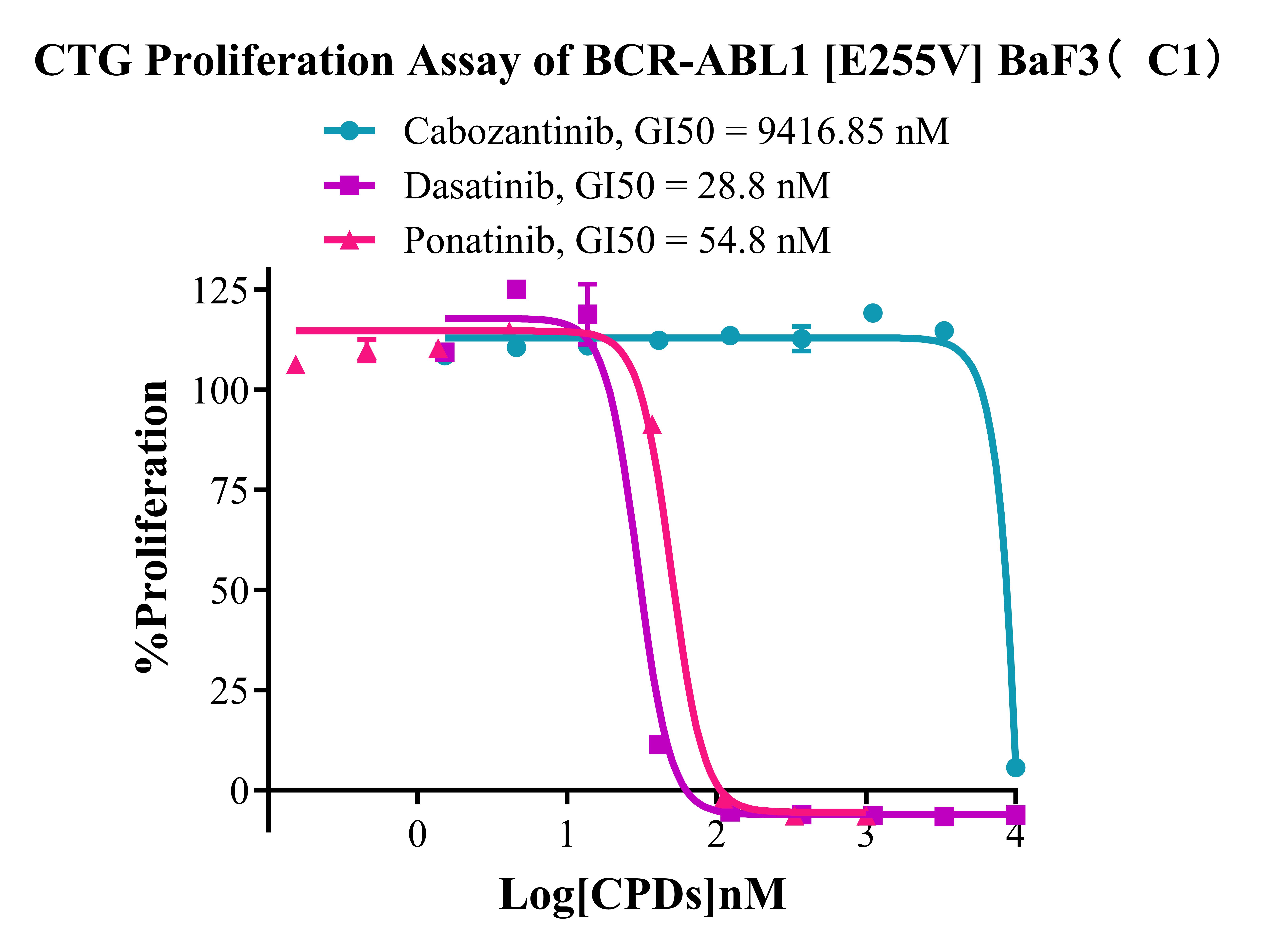 BCR-ABL1[E255V] BaF3 藥靶細(xì)胞 , 通過(guò)轉(zhuǎn)導(dǎo)突變狀態(tài)的 BCR- ABL1[E255V]基因到 BaF3 細(xì)胞系中,穩(wěn)定表達(dá)人突變形態(tài)下的 BCR-ABL1[E255V]基因。
