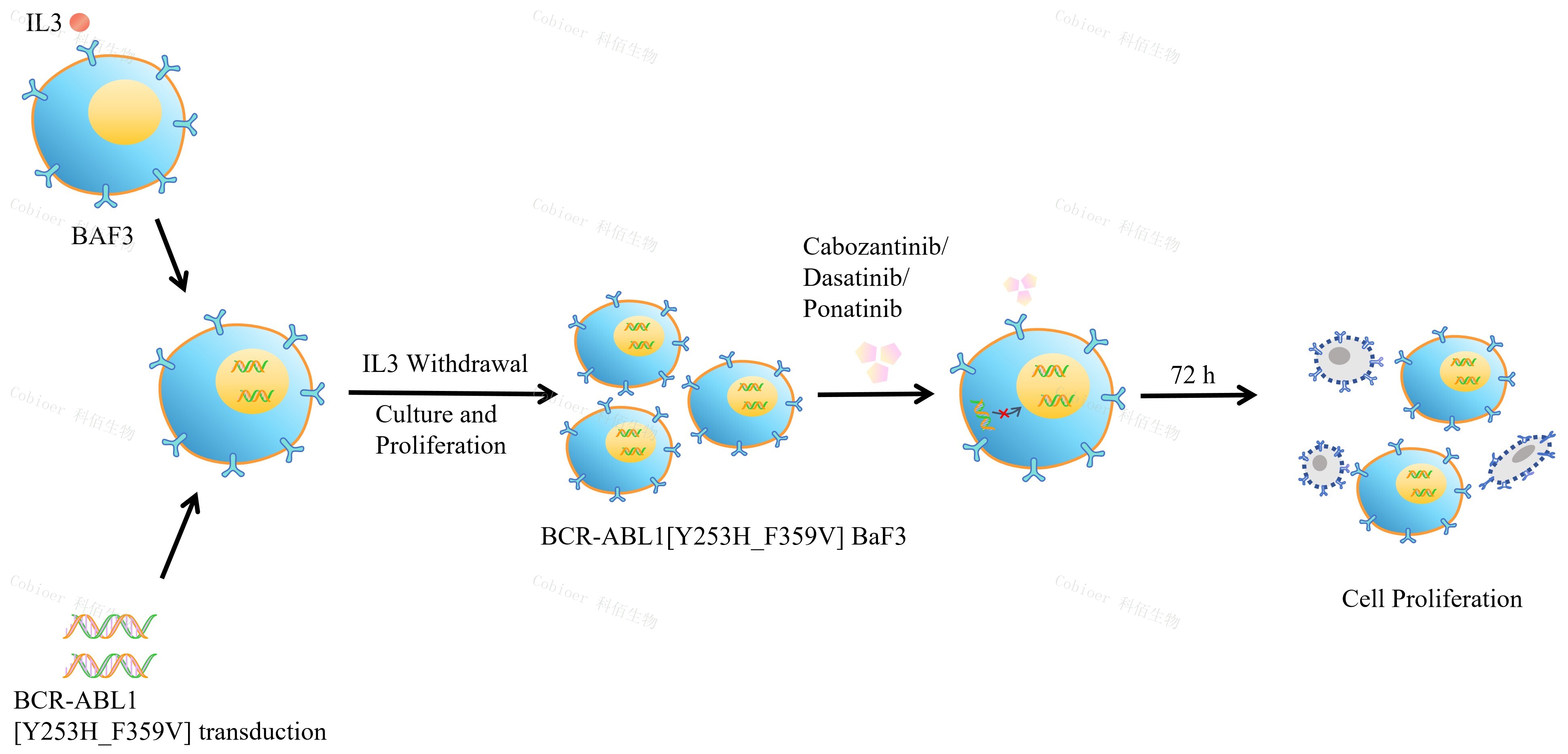 | BCR-ABL1[Y253H_F359V] BaF3 藥靶細(xì)胞,通過轉(zhuǎn)導(dǎo)突變狀態(tài)的 BCR- ABL1[Y253H_F359V] 基因到 BaF3 細(xì)胞系中, 穩(wěn)定表達(dá)人突變形態(tài)下的 BCR- ABL1[Y253H_F359V]基因。 BaF3(小鼠原 B 細(xì)胞)的生長和增殖需要 IL-3 的維持。通過引入各種表達(dá)激酶的基因, 能作為 BaF3 的驅(qū)動(dòng)基因,讓 BaF3 不再依賴 IL-3 而增殖,進(jìn)而激酶基因成為 BaF3 增殖依賴的驅(qū)動(dòng)基因,用于評估小分子藥物對激酶的靶向抑制作用,原理及流程見下圖所示。 ![]() Figure 1. BCR-ABL1[Y253H_F359V] BaF3 細(xì)胞的構(gòu)建原理圖 |