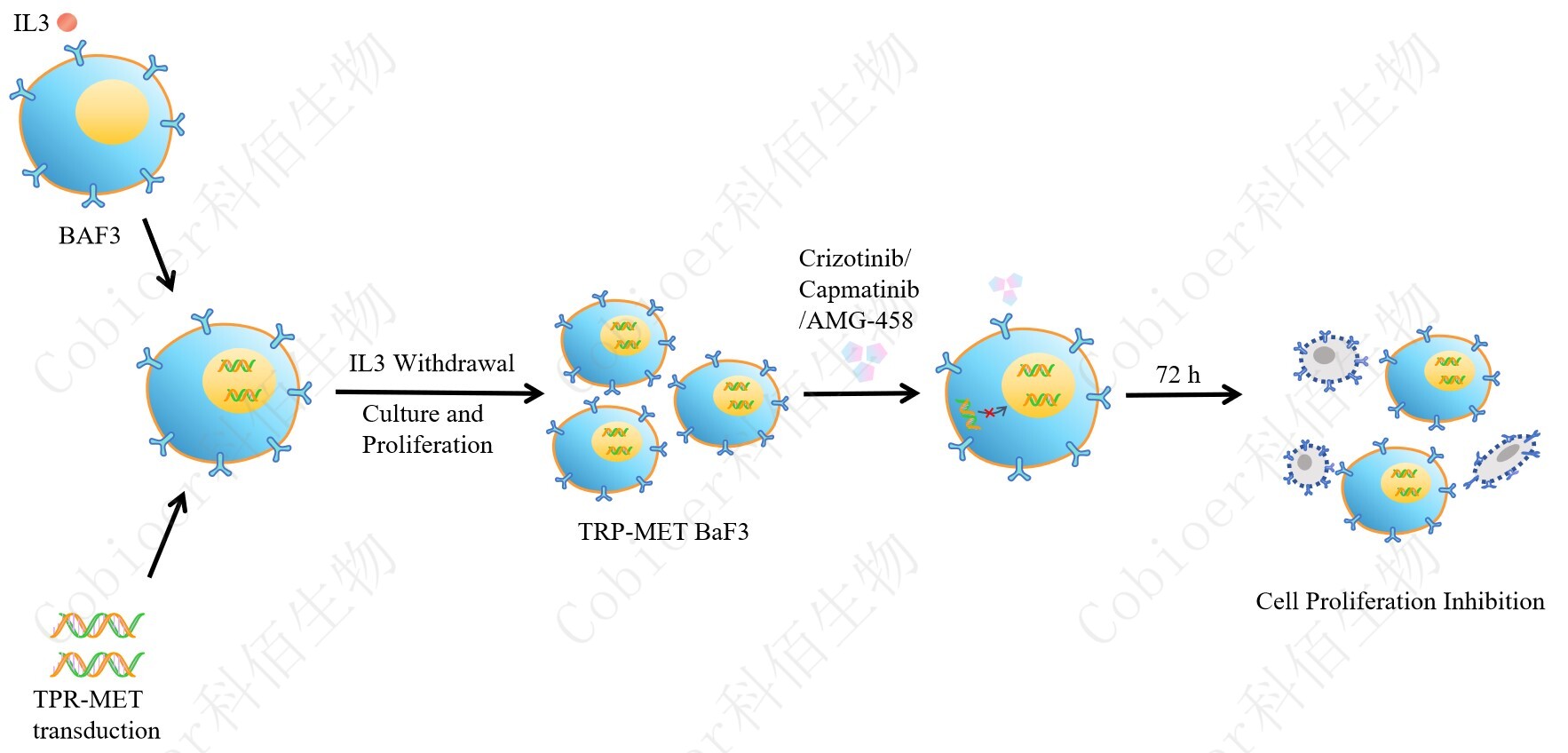 BaF3(小鼠原 B 細(xì)胞)的生長(zhǎng)和增殖需要 IL-3 的維持。通過(guò)引入各種表達(dá)激酶的基因, 能作為 BaF3 的驅(qū)動(dòng)基因,讓 BaF3 不再依賴(lài) IL-3 而增殖,進(jìn)而激酶基因成為 BaF3 增殖依 賴(lài)的驅(qū)動(dòng)基因,用于評(píng)估小分子藥物對(duì)激酶的靶向抑制作用,原理及流程見(jiàn)下圖所示。![]() Figure 1. TPR-MET BaF3 細(xì)胞的構(gòu)建原理圖 |