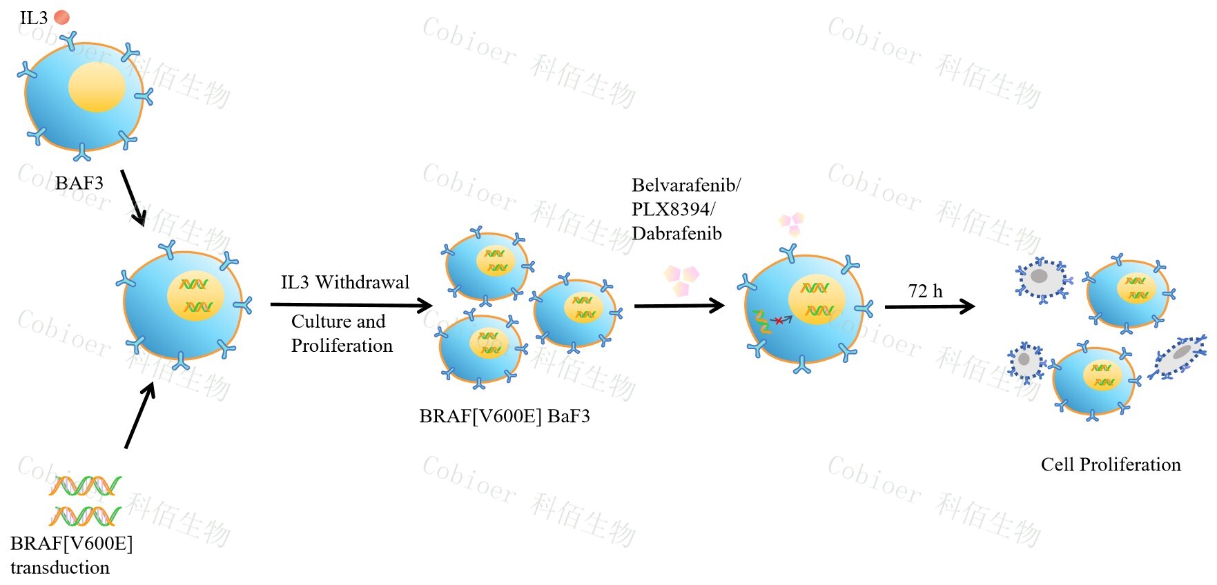 BaF3(小鼠原 B 細(xì)胞)的生長和增殖需要 IL-3 的維持。通過引入各種表達(dá)激酶的基因, 能作為 BaF3 的驅(qū)動基因,讓 BaF3 不再依賴 IL-3 而增殖,進(jìn)而激酶基因成為 BaF3 增殖依 賴的驅(qū)動基因,用于評估小分子藥物對激酶的靶向抑制作用,原理及流程見圖 1 所示。 ![]() Figure 1. BRAF[V600E] BaF3 細(xì)胞的構(gòu)建原理圖 |