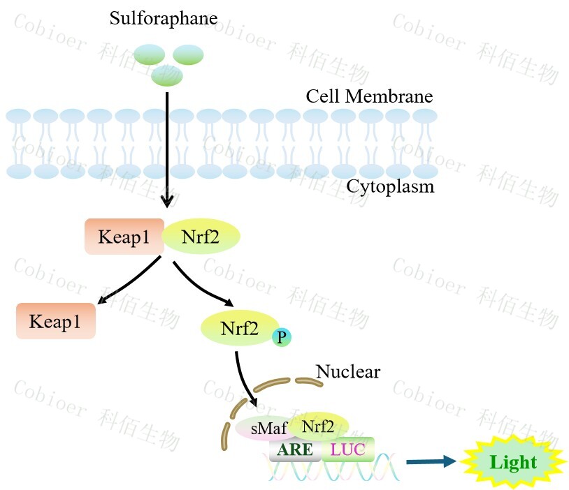 ARE-Luc(Nrf2 Antioxidant Pathway) HEK293 報(bào)告基因細(xì)胞,是由 ARE 調(diào)控并表達(dá) Luc 熒光素酶報(bào)告基因的 HEK293 細(xì)胞。Sulforaphane 是 Keap1/Nrf2/ARE 的誘 導(dǎo)劑,原理見下圖所示。![]() Figure 1. ARE-Luc(Nrf2 Antioxidant Pathway) HEK293 細(xì)胞模型原理圖