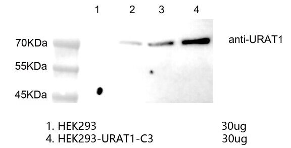 | URAT1, a member of the OAT (organic anion transporter) family, is an anion-exchanging uptake transporter localized to the apical (brush border) membrane of renal proximal tubular cells, where it mediates the re-absorption of uric acid from the proximal tubule, thereby playing a key role in uric acid homeostasis. | |
