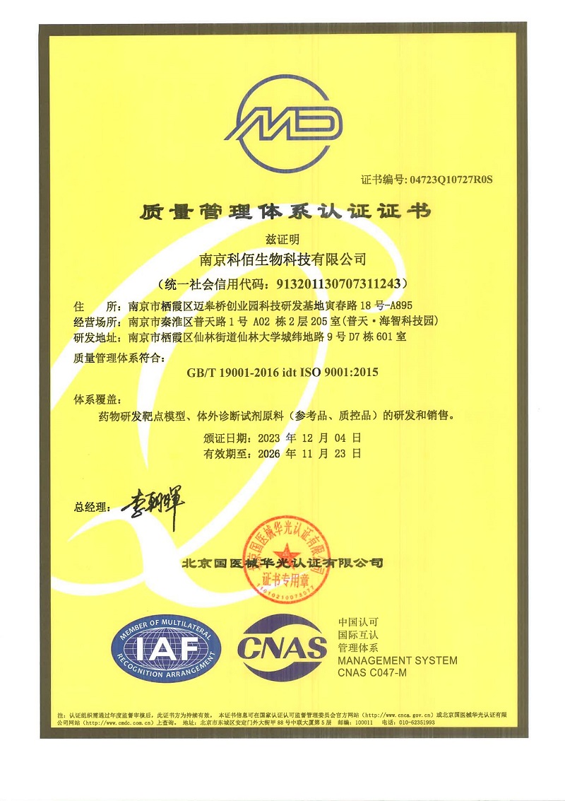 ISO 9001:2015 認(rèn)證范圍:藥物研發(fā)靶點(diǎn)模型、體外診斷試劑原料(參考品、質(zhì)控品) 的研發(fā)和銷售。