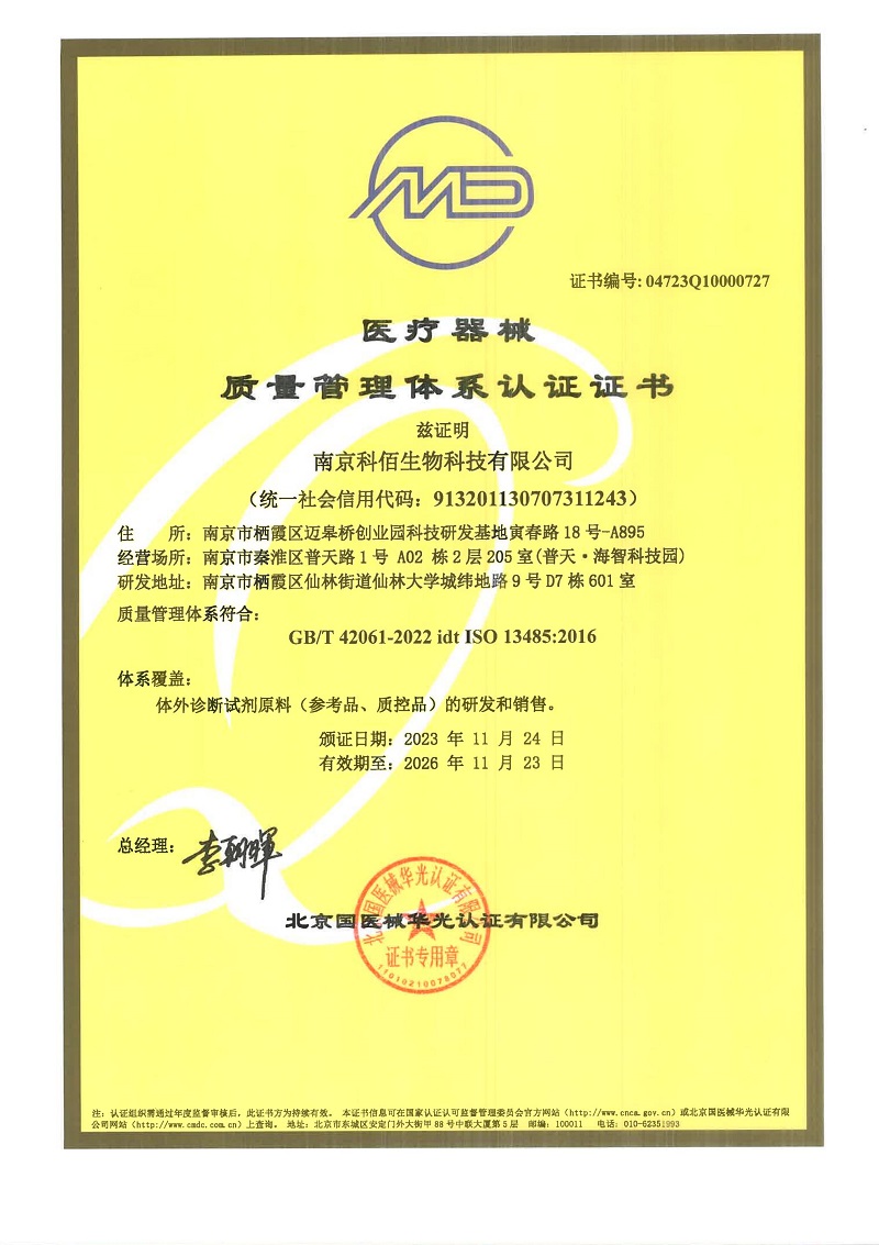 ISO 13485:2016 認(rèn)證范圍:體外診斷試劑原料(參考品、質(zhì)控品) 的研發(fā)和銷售。