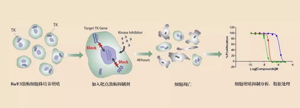 我們結(jié)合自己多年在細(xì)胞領(lǐng)域的豐富經(jīng)驗(yàn),在 Ba/F3(小鼠原B細(xì)胞)上進(jìn)行改造,引入相應(yīng)表達(dá)激酶基因,這些基因能作為Ba/F3的驅(qū)動基因,讓Ba/F3不再依賴IL-3而增殖,進(jìn)而激酶基因成為Ba/F3增殖依賴的驅(qū)動基因,用于評估小分子藥物對激酶的靶向抑制作用。