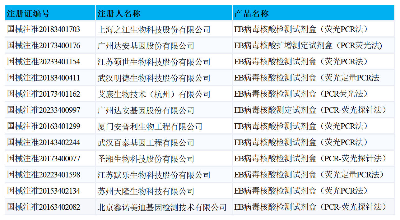 截至目前,已有12款EB病毒核酸檢測(cè)相關(guān)試劑盒獲批,具體如下: