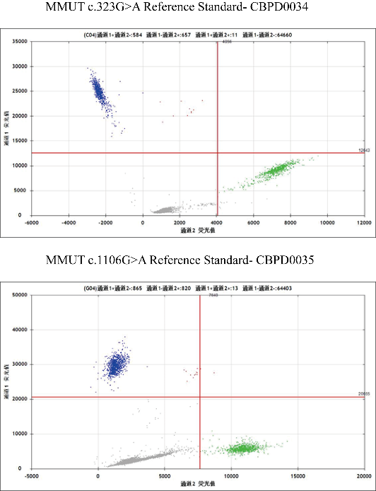 圖 2. Results of dPCR with MMUT c.323G>A Reference Standard and MMUT c.1106G>A Reference Standard.