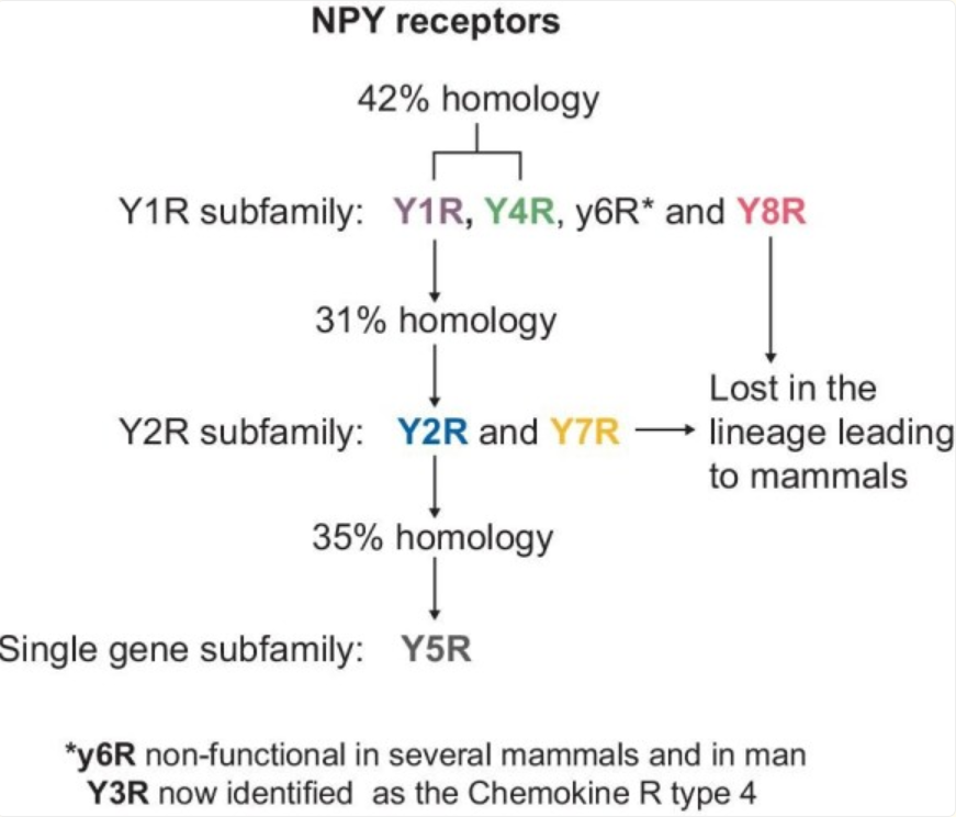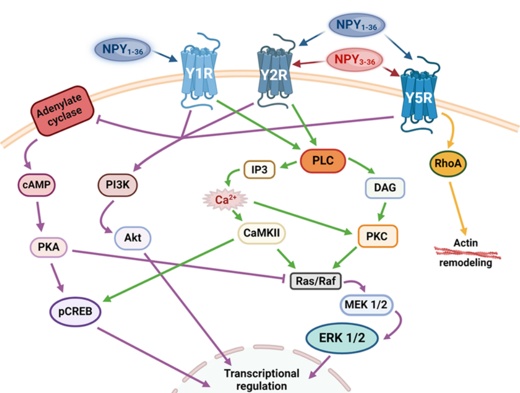 在人類中,NPY主要通過三種GPCR- Y1R、Y2R和Y5R起作用。Y1R需要全長NPY1-36才能激活,而Y2R和Y5R也可以結(jié)合NPY3-36。所有NPY受體通過Gi/o蛋白發(fā)出信號,并通過腺苷酸環(huán)化酶抑制cAMP合成,從而阻斷PKA對下游通路的抑制作用。NPY信號傳導的第二種機制是針對Y1R和Y2R的,涉及Ca 2 +的動員以及隨后PKC和CaMKII的鈣依賴性激活。同時,這些信號通路導致ERK1/2的激活。此外,所有NPY受體都能夠激活PI3K/Akt通路。Y5R的具體特征是能夠激活RhoA,從而調(diào)節(jié)細胞骨架重塑。