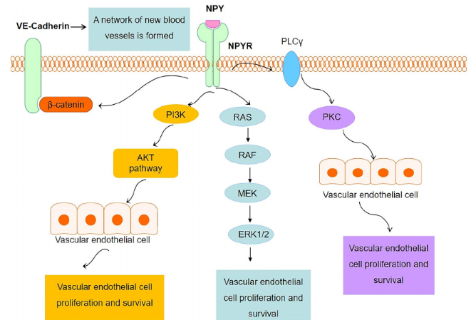 以血管內(nèi)皮細胞為例,NPY與其受體結(jié)合后,通過PI3K/AKT通路、RAS/RAF/MEK/ERK1/2通路、PKC通路促進內(nèi)皮細胞增殖,為血管提供營養(yǎng),調(diào)節(jié)微環(huán)境。