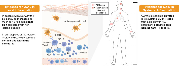 有研究證明OX40通路的激活參與了AD患者的全身和局部炎癥(如下圖所示)。雖然OX40L的表達(主要是單核細胞)在AD患者和健康對照組之間沒有差異,但在AD患者循環(huán)CD4+ T細胞中OX40的表達升高。在AD患者的外周血中,活化的CD4+ T細胞上OX40的表達比未表達抗原的活化CD4+ T細胞上OX40的表達增加。AD患者病變皮膚中OX40+細胞(可能是T細胞)和OX40L+樹突狀細胞的數(shù)量比銀屑病和非病變皮膚多。一項研究表明,在AD患者中,皮損皮膚中OX40+ T細胞比非皮損皮膚增加了10倍之多。在AD病變的皮膚活檢中,發(fā)現(xiàn)OX40+真皮細胞和OX40L+細胞(可能是肥大細胞)在真皮內(nèi)共定位,在角質(zhì)形成細胞上可見OX40L的表達,提示OX40信號的局部活性。